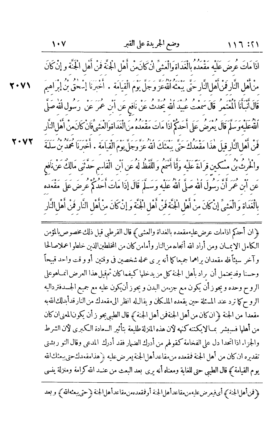 [2070] إِنَّ أَحَدَكُمْ إِذَا مَاتَ عُرِضَ عَلَيْهِ مَقْعَدُهُ بِالْغَدَاةِ وَالْعَشِيِّ قَالَ الْقُرْطُبِيُّ قِيلَ ذَلِكَ مَخْصُوصٌ بِالْمُؤْمِنِ الْكَامِلِ الْإِيمَانِ وَمَنْ أَرَادَ اللَّهُ إِنْجَاءَهُ مِنَ النَّارِ وَأَمَّا مَنْ كَانَ مِنَ الْمُخَلِّطِينَ الَّذِينَ خَلَطُوا عَمَلًا صَالِحًا وَآخَرَ سَيِّئًا فَلَهُ مقعدان يراهما جَمِيعًا كَمَا أَنَّهُ يَرَى عَمَلَهُ شَخْصَيْنِ فِي وَقْتَيْنِ أَوْ وَقْتٍ وَاحِدٍ قَبِيحًا وَحَسَنًا وَقَدْ يَحْتَمِلُ أَنْ يُرَادَ بِأَهْلِ الْجَنَّةِ كُلُّ مَنْ يَدْخُلُهَا كَيْفَمَا كَانَ ثُمَّ قِيلَ هَذَا الْعَرْضُ إِنَّمَا هُوَ عَلَى الرُّوحِ وَحْدَهُ وَيَجُوزُ أَنْ يَكُونَ مَعَ جُزْءٍ مِنَ الْبَدَنِ وَيَجُوزُ أَنْ يَكُونَ عَلَيْهِ مَعَ جَمِيعِ الْجَسَدِ فَتُرَدُّ إِلَيْهِ الرُّوحُ كَمَا تُرَدُّ عِنْدَ الْمَسْأَلَةِ حِينَ يُقْعِدَهُ الْمَلَكَانِ وَيُقالُ لَهُ انْظُر إِلَى مَقْعَدك من النَّار قد أبدلك الله بِهِ مقْعدا من الْجنَّة إِنْ كَانَ مِنْ أَهْلِ الْجَنَّةِ فَمِنْ أَهْلِ الْجَنَّةِ قَالَ الطِّيبِيُّ يَجُوزُ أَنْ يَكُونَ الْمَعْنَى إِنْ كَانَ مِنْ أَهْلِهَا فَسَيُبَشَّرُ بِمَا لَا يَكْتَنِهِ كُنْهَهُ لِأَنَّ هَذِهِ الْمَنْزِلَةَ طَلِيعَةٌ بِتَأْثِيرِ السَّعَادَةِ الْكُبْرَى لِأَنَّ الشَّرْطَ وَالْجَزَاءَ إِذَا اتَّحَدَا دَلَّ عَلَى الْفَخَامَةِ كَقَوْلِهِمْ مَنْ أَدْرَكَ الضِّمَارَ فَقَدْ أَدْرَكَ الْمُدَّعَى وَقَالَ التُّورِبِشْتِيُّ تَقْدِيرُهُ إِنْ كَانَ مِنْ أَهْلِ الْجَنَّةِ فَمَقْعَدُهُ مِنْ مَقَاعِدِ أَهْلِ الْجَنَّةِ يُعْرَضُ عَلَيْهِ