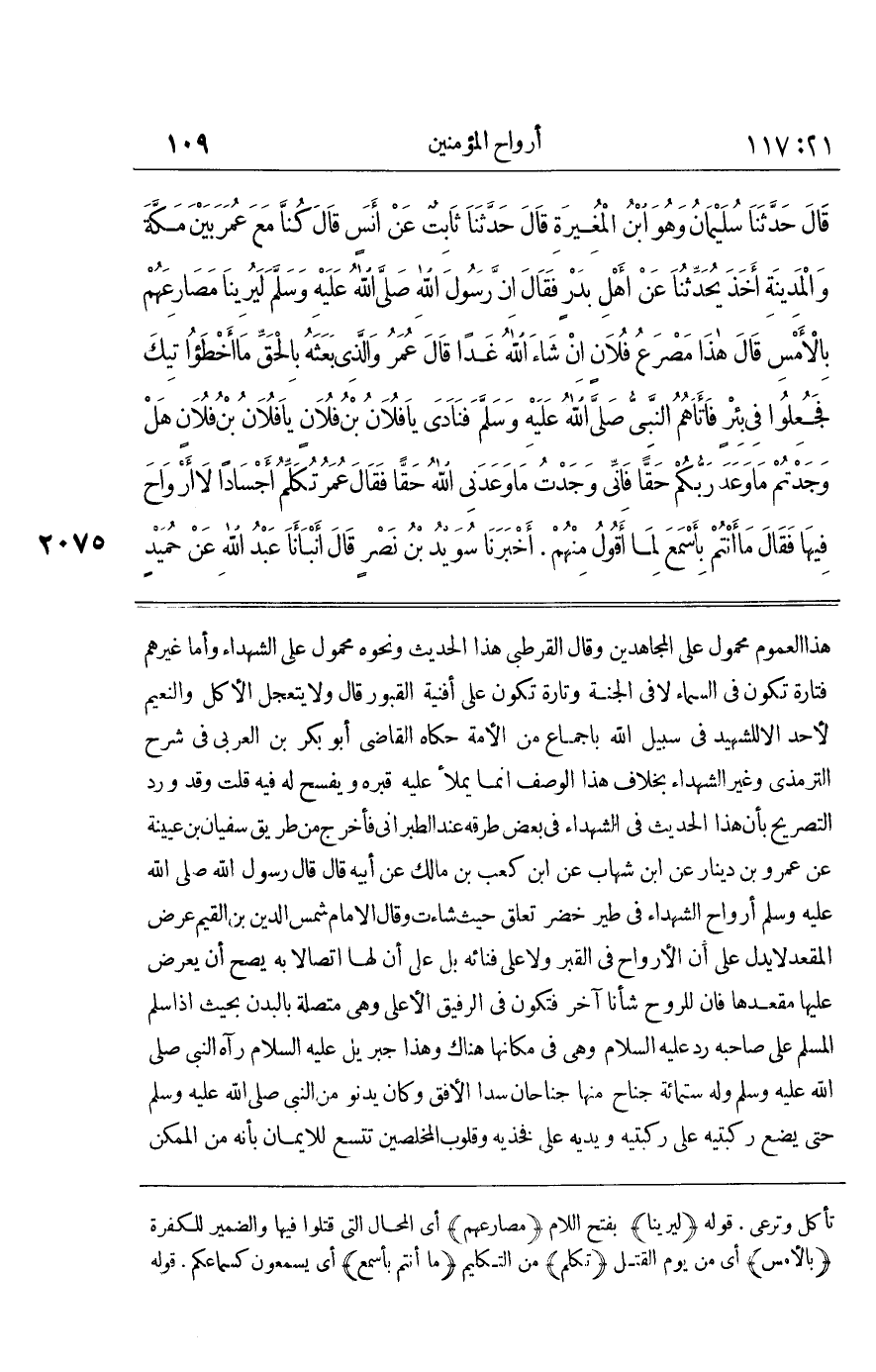 هَذَا الْعُمُومُ مَحْمُولٌ عَلَى الْمُجَاهِدِينَ وَقَالَ الْقُرْطُبِيُّ هَذَا الْحَدِيثُ وَنَحْوُهُ مَحْمُولٌ عَلَى الشُّهَدَاءِ وَأَمَّا غَيْرُهُمْ فَتَارَةً تَكُونُ فِي السَّمَاءِ لَا فِي الْجَنَّةِ وَتَارَةً تَكُونُ عَلَى أَفْنِيَةِ الْقُبُورِ قَالَ وَلَا يُتَعَجَّلُ الْأَكْلُ وَالنَّعِيمُ لِأَحَدٍ إِلَّا لِلشَّهِيدِ فِي سَبِيلِ اللَّهِ بِإِجْمَاعٍ مِنَ الْأُمَّةِ حَكَاهُ الْقَاضِي أَبُو بَكْرِ بْنُ الْعَرَبِيِّ فِي شَرْحِ التِّرْمِذِيِّ وَغَيْرُ الشُّهَدَاءِ بِخِلَافِ هَذَا الْوَصْفِ إِنَّمَا يُمْلَأُ عَلَيْهِ قَبْرُهُ وَيُفْسَحُ لَهُ فِيهِ قُلْتُ وَقَدْ وَرَدَ التَّصْرِيحُ بِأَنَّ هَذَا الْحَدِيثِ فِي الشُّهَدَاءِ فِي بَعْضِ طُرُقِهِ عِنْدَ الطَّبَرَانِيِّ فَأَخْرَجَ مِنْ طَرِيقِ سُفْيَانَ بْنِ عُيَيْنَةَ عَنْ عَمْرِو بْنِ دِينَارٍ عَن بن شهَاب عَن بْنِ كَعْبِ بْنِ مَالِكٍ عَنْ أَبِيهِ قَالَ قَالَ رَسُولُ اللَّهِ صَلَّى اللَّهُ عَلَيْهِ وَسَلَّمَ أَرْوَاحُ الشُّهَدَاءِ فِي طَيْرٍ خُضْرٍ تَعْلَقُ حَيْثُ شَاءَتْ وَقَالَ الْإِمَامُ شَمْسُ الدِّينِ بْنُ الْقَيِّمِ عَرْضُ الْمَقْعَدِ لَا يَدُلُّ عَلَى أَنَّ الْأَرْوَاحَ فِي الْقَبْرِ وَلَا عَلَى فِنَائِهِ بَلْ عَلَى أَنَّ لَهَا اتِّصَالًا بِهِ يَصِحُّ أَنْ يُعْرَضَ عَلَيْهَا مَقْعَدُهَا فَإِنَّ لِلرُّوحِ شَأْنًا آخَرَ فَتَكُونُ فِي الرَّفِيقِ الْأَعْلَى وَهِيَ مُتَّصِلَةٌ بِالْبَدَنِ بِحَيْثُ إِذَا سَلَّمَ الْمُسْلِمُ عَلَى صَاحِبِهِ رَدَّ عَلَيْهِ السَّلَامُ وَهِيَ فِي مَكَانِهَا هُنَاكَ وَهَذَا جِبْرِيلُ عَلَيْهِ السَّلَامُ رَآهُ النَّبِيُّ صَلَّى اللَّهُ عَلَيْهِ وَسَلَّمَ وَلَهُ سِتُّمِائَةِ جَنَاحٍ مِنْهَا جَنَاحَانِ سَدَّا الْأُفُقَ وَكَانَ يَدْنُو مِنَ النَّبِيِّ صَلَّى اللَّهُ عَلَيْهِ وَسَلَّمَ حَتَّى يَضَعَ رُكْبَتَيْهِ عَلَى رُكْبَتَيْهِ وَيَدَيْهِ عَلَى فَخْذَيْهِ وَقُلُوبَ الْمُخْلِصِينَ تَتَّسِعُ لِلْإِيمَانِ بِأَنَّهُ من الْمُمكن