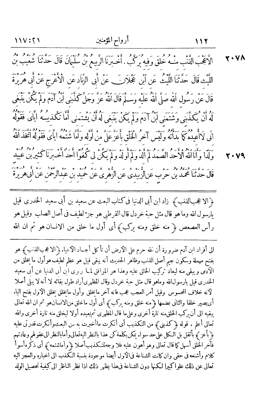 [2077] الا عجب الذَّنب زَاد بن أَبِي الدُّنْيَا فِي كِتَابِ الْبَعْثِ عَنْ سَعِيدِ بْنِ أَبِي سَعِيدٍ الْخُدْرِيِّ قِيلَ يَا رَسُولَ اللَّهِ وَمَا هُوَ قَالَ مِثْلُ حَبَّةِ خَرْدَلٍ قَالَ الْقُرْطُبِيُّ هُوَ جُزْءٌ لَطِيفٌ فِي أَصْلِ الصُّلْبِ وَقِيلَ هُوَ رَأْسُ الْعُصْعُصِ مِنْهُ خُلِقَ وَمِنْهُ يُرَكَّبُ أَيْ أَوَّلُ مَا خُلِقَ مِنَ الْإِنْسَانِ هُوَ ثُمَّ إِنَّ اللَّهَ تَعَالَى يُبْقِيهِ إِلَى أَنْ يُرَكَّبَ الْخَلْقُ مِنْهُ تَارَةً أُخْرَى