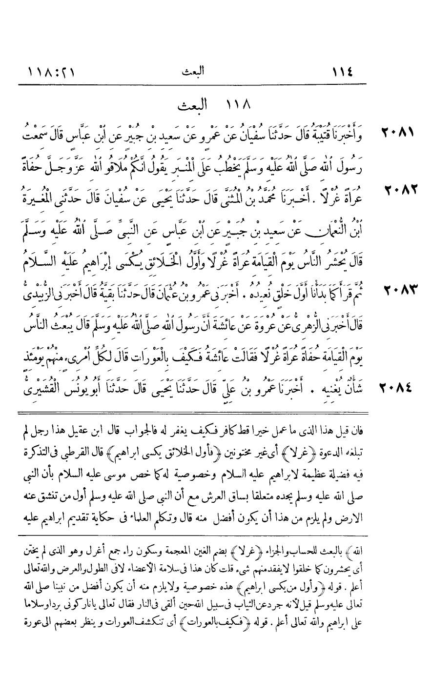 فَإِنْ قِيلَ هَذَا الَّذِي مَا عَمِلَ خَيْرًا قَطُّ كَافِرٌ فَكَيْفَ يُغْفَرُ لَهُ فَالْجَوَابُ قَالَ بن عقيل هَذَا رجل لم تبلغه الدعْوَة غُرْلًا أَيْ غَيْرُ مَخْتُونِينَ فَأَوَّلُ الْخَلَائِقِ يُكْسَى إِبْرَاهِيمُ قَالَ الْقُرْطُبِيُّ فِي التَّذْكِرَةِ فِيهِ فَضِيلَةٌ عَظِيمَةٌ لِإِبْرَاهِيمَ عَلَيْهِ السَّلَامُ وَخُصُوصِيَّةٌ لَهُ كَمَا خُصَّ مُوسَى عَلَيْهِ السَّلَامُ بِأَنَّ النَّبِيَّ صَلَّى اللَّهُ عَلَيْهِ وَسَلَّمَ يَجِدُهُ مُتَعَلِّقًا بِسَاقِ الْعَرْشِ مَعَ أَنَّ النَّبِيَّ صَلَّى اللَّهُ عَلَيْهِ وَسَلَّمَ أَوَّلُ مَنْ تَنْشَقُّ عَنْهُ الْأَرْضُ وَلَمْ يَلْزَمُ مِنْ هَذَا أَنْ يَكُونَ أَفْضَلَ مِنْهُ قَالَ وَتَكَلَّمَ الْعُلَمَاءُ فِي حِكَايَةِ تَقْدِيمِ إِبْرَاهِيمَ عَلَيْهِ