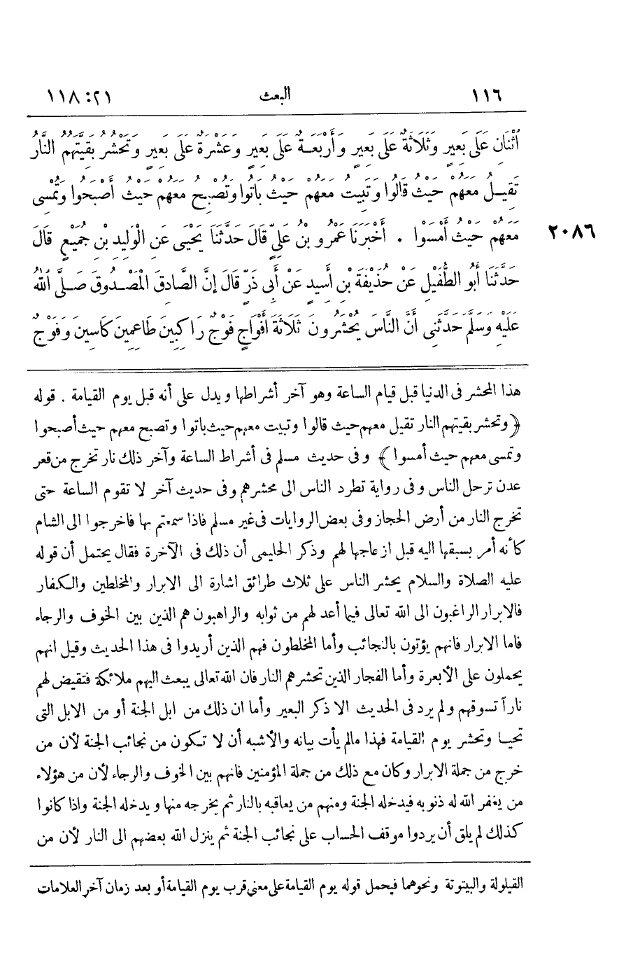 هَذَا الْمَحْشَرُ فِي الدُّنْيَا قَبْلَ قِيَامِ السَّاعَةِ وَهُوَ آخِرُ أَشْرَاطِهَا وَيَدُلُّ عَلَى أَنَّهُ قَبْلَ يَوْمِ الْقِيَامَةِ قَوْلُهُ وَتَحْشُرُ بَقِيَّتَهُمُ النَّارُ تَقِيلُ مَعَهُمْ حَيْثُ قَالُوا وَتَبِيتُ مَعَهُمْ حَيْثُ بَاتُوا وَتُصْبِحُ مَعَهُمْ حَيْثُ أَصْبَحُوا وَتُمْسِي مَعَهُمْ حَيْثُ أَمْسَوْا وَفِي حَدِيثِ مُسْلِمٍ فِي أَشْرَاطِ السَّاعَةِ وَآخِرُ ذَلِكَ نَارٌ تَخْرُجُ مِنْ قَعْرِ عَدَنٍ تُرَحِّلُ النَّاسَ وَفِي رِوَايَةٍ تَطْرُدُ النَّاسَ إِلَى مَحْشَرِهِمْ وَفِي حَدِيثٍ آخَرَ لَا تَقُومُ السَّاعَةُ حَتَّى تَخْرُجَ النَّارُ مِنْ أَرْضِ الْحِجَازِ وَفِي بَعْضِ الرِّوَايَاتِ فِي غَيْرِ مُسْلِمٍ فَإِذَا سَمِعْتُمْ بِهَا فَاخْرُجُوا إِلَى الشَّامِ كَأَنَّهُ أَمَرَ بِسَبْقِهَا إِلَيْهِ قَبْلَ إِزْعَاجِهَا لَهُمْ وَذَكَرَ الْحَلِيمِيُّ أَنَّ ذَلِكَ فِي الْآخِرَةِ فَقَالَ يَحْتَمِلُ أَنَّ قَوْلَهُ عَلَيْهِ الصَّلَاةُ وَالسَّلَامُ يُحْشَرُ النَّاسُ عَلَى ثَلَاثِ طَرَائِقَ إِشَارَةٌ إِلَى الْأَبْرَارِ وَالْمُخَلِّطِينِ وَالْكُفَّارِ فَالْأَبْرَارُ الرَّاغِبُونَ إِلَى اللَّهِ تَعَالَى فِيمَا أَعَدَّ لَهُمْ مِنْ ثَوَابِهِ وَالرَّاهِبُونَ هُمُ الَّذِينَ بَيْنَ الْخَوْفِ وَالرَّجَاءِ فَأَمَّا الْأَبْرَارُ فَإِنَّهُمْ يُؤْتَوْنَ بِالنَّجَائِبِ وَأَمَّا الْمُخَلِّطُونَ فَهُمُ الَّذِينَ أُرِيدُوا فِي هَذَا الْحَدِيثِ وَقِيلَ إِنَّهُمْ يُحْمَلُونَ عَلَى الْأَبْعِرَةِ وَأَمَّا الْفُجَّارُ الَّذِينَ تَحْشُرُهُمُ النَّارُ فَإِنَّ اللَّهَ تَعَالَى يَبْعَثُ إِلَيْهِمْ مَلَائِكَةً فَتُقَيِّضُ لَهُمْ نَارًا تَسُوقُهُمْ وَلَمْ يَرِدْ فِي الْحَدِيثِ إِلَّا ذِكْرَ الْبَعِيرِ وَأَمَّا أَنَّ ذَلِكَ مِنْ إِبِلِ الْجَنَّةِ أَوْ مِنَ الْإِبِلِ الَّتِي تَحْيَا وَتُحْشَرُ يَوْمَ الْقِيَامَةِ فَهَذَا مَا لَمْ يَأْتِ بَيَانُهُ وَالْأَشْبَهُ أَنْ لَا تَكُونَ مِنْ نَجَائِبِ الْجَنَّةِ لِأَنَّ مَنْ خَرَجَ مِنْ جُمْلَةِ الْأَبْرَارِ وَكَانَ مَعَ ذَلِكَ مِنْ جَمَلَةِ الْمُؤْمِنِينَ فَإِنَّهُمْ بَيْنَ الْخَوْفِ وَالرَّجَاءِ لِأَنَّ مِنْ هَؤُلَاءِ مَنْ يَغْفِرُ اللَّهُ لَهُ ذُنُوبَهُ فَيُدْخِلُهُ الْجَنَّةَ وَمِنْهُمْ مَنْ يُعَاقِبُهُ بِالنَّارِ ثُمَّ يُخْرِجُهُ مِنْهَا وَيُدْخِلُهُ الْجَنَّةَ وَإِذَا كَانُوا كَذَلِكَ لَمْ يَلِقْ أَنْ يَرِدُوا مَوْقِفَ الْحِسَابِ عَلَى نَجَائِبِ الْجَنَّةِ ثُمَّ يُنْزِلُ اللَّهُ بَعْضَهُمْ إِلَى النَّارِ لِأَنَّ مَنْ