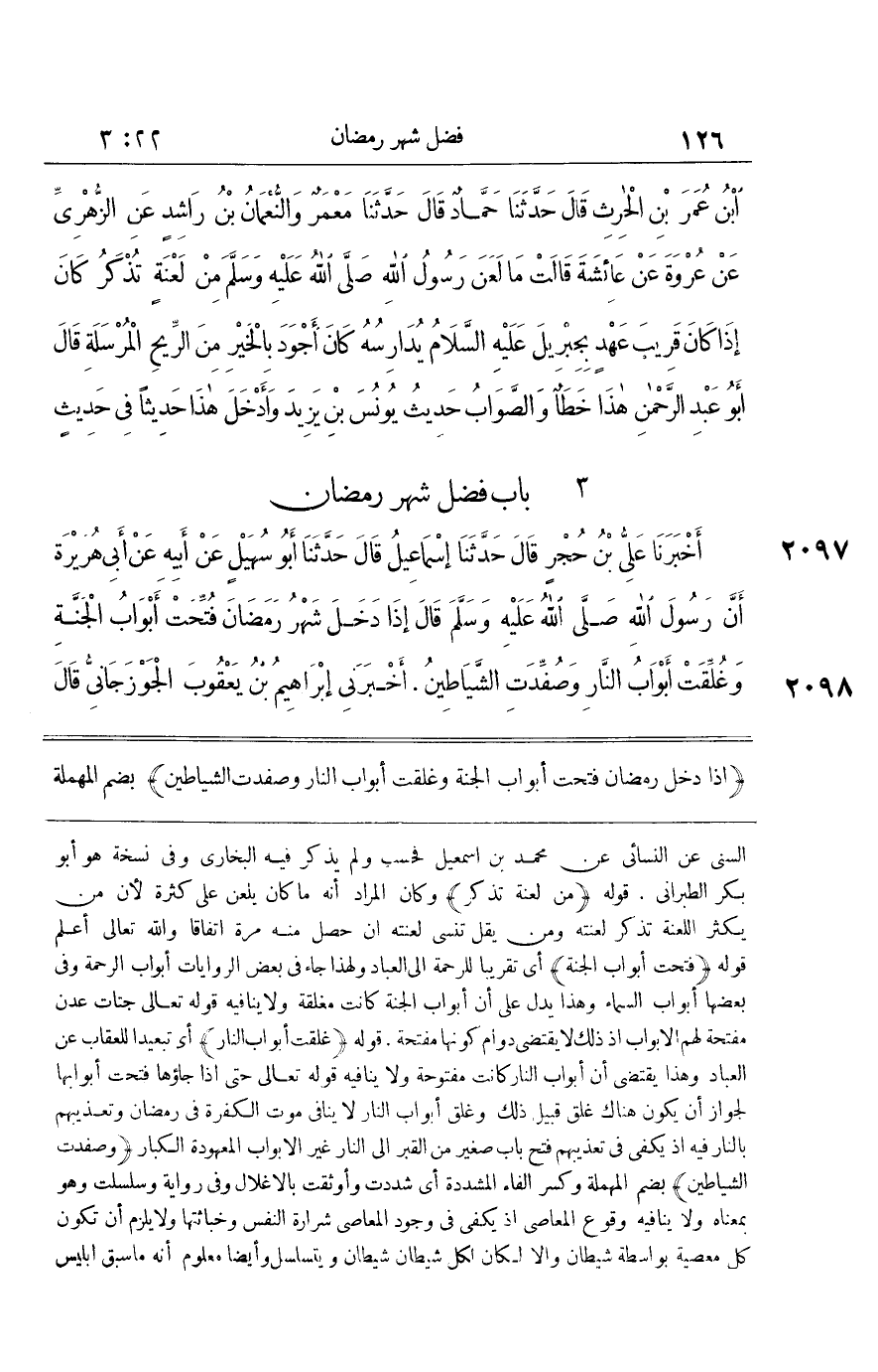 [2098] إِذَا دَخَلَ رَمَضَانُ فُتِّحَتْ أَبْوَابُ الْجَنَّةِ وَغُلِّقَتْ أَبْوَابُ النَّارِ وَصُفِّدَتِ الشَّيَاطِينُ بِضَمِّ الْمُهْمَلَةِ وَكَسْرِ الْفَاءِ الْمُشَدَّدَةِ أَيْ شُدِّدَتْ وَأُوثِقَتْ بِالْأَغْلَالِ قَالَ الْحَلِيمِيُّ يَحْتَمِلُ أَنْ يَكُونَ الْمُرَادُ أَنَّ الشَّيَاطِينَ مُسْتَرِقُو السَّمْعِ مِنْهُمْ وَأَنَّ تَسَلُّطَهُمْ يَقَعُ فِي لَيَالِي رَمَضَانَ دُونَ أَيَّامِهِ لِأَنَّهُمْ كَانُوا مُنِعُوا فِي زَمَنِ نُزُولِ الْقُرْآنِ مِنَ اسْتِرَاقِ السَّمْعِ فَزِيدَ وَالتَّسَلْسُلُ مُبَالَغَةٌ فِي الْحِفْظِ وَيَحْتَمِلُ أَنْ يَكُونَ الْمُرَادُ أَنَّ الشَّيَاطِينَ لَا يَخْلُصُونَ مِنْ إِفْسَادِ الْمُؤْمِنِينَ إِلَى مَا يَخْلُصُونَ إِلَيْهِ فِي غَيره لَا شتغالهم بِالصِّيَامِ الَّذِي فِيهِ قَمْعُ الشَّهَوَاتِ وَبِقِرَاءَةِ الْقُرْآنِ وَالذِّكْرِ وَقَالَ غَيْرُهُ الْمُرَادُ بِالشَّيَاطِينِ بَعْضُهُمْ وَهُمُ الْمَرَدَةُ مِنْهُمْ وَيُؤَيِّدُهُ قَوْلُهُ فِي الْحَدِيثِ بَعْدَ هَذَا