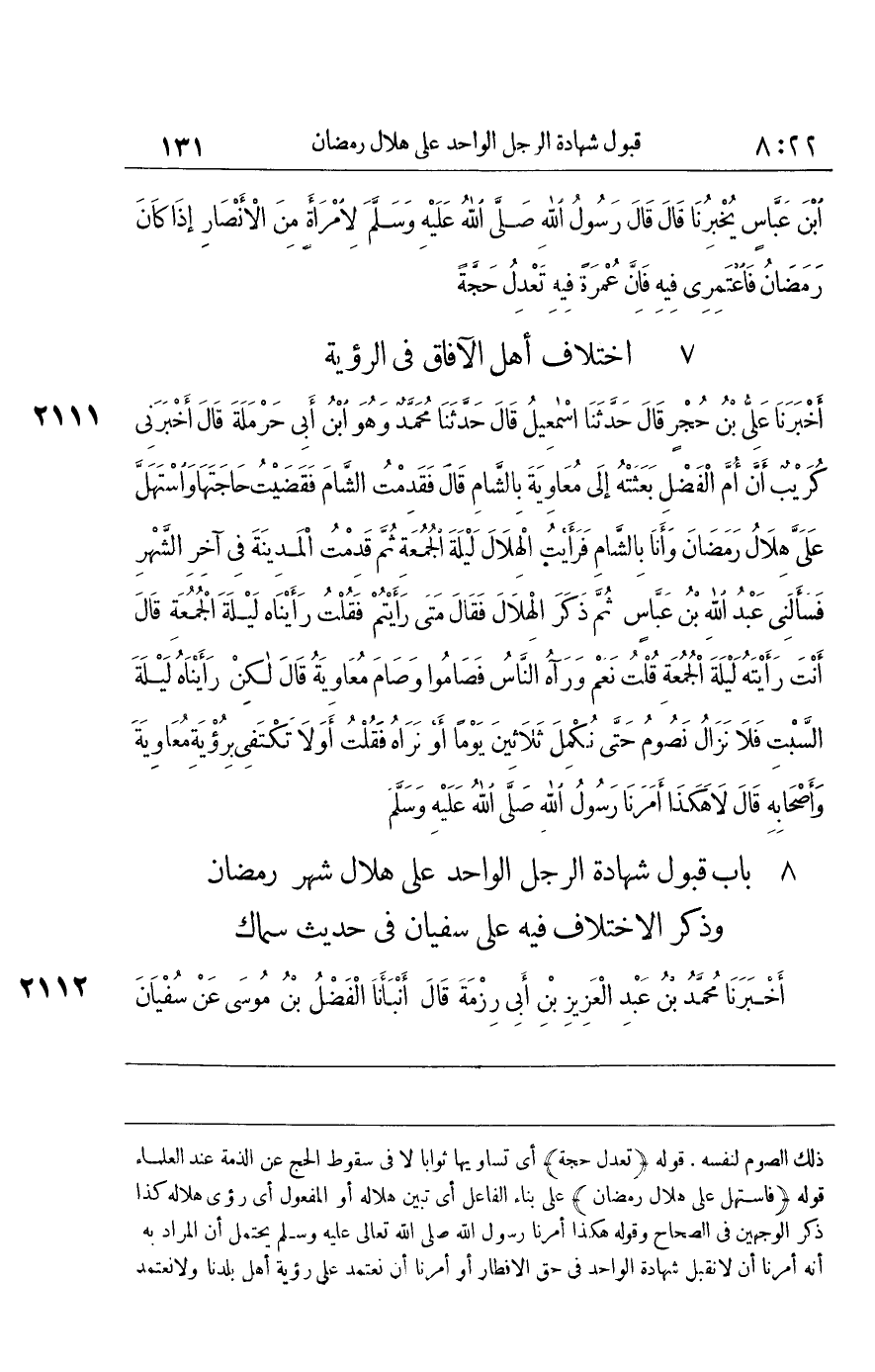 [2111] هَكَذَا أمرنَا رَسُول الله صلى الله تَعَالَى عَلَيْهِ وَسلم يحْتَمل أَن المُرَاد بِهِ أَنه أمرنَا أَن لَا نقبل شَهَادَة الْوَاحِد فِي حق الْإِفْطَار أَو أمرنَا أَن نعتمد على رُؤْيَة أهل بلدنا وَلَا نعتمد على رُؤْيَة غَيرهم والى الْمَعْنى الثَّانِي تميل تَرْجَمَة المُصَنّف وَغَيره لَكِن الْمَعْنى الأول مُحْتَمل فَلَا يَسْتَقِيم الِاسْتِدْلَال إِذْ الِاحْتِمَال يفْسد الِاسْتِدْلَال وَكَأَنَّهُم رَأَوْا أَن الْمُتَبَادر هُوَ الثَّانِي فبنوا عَلَيْهِ الِاسْتِدْلَال وَالله تَعَالَى أعلم قَوْله