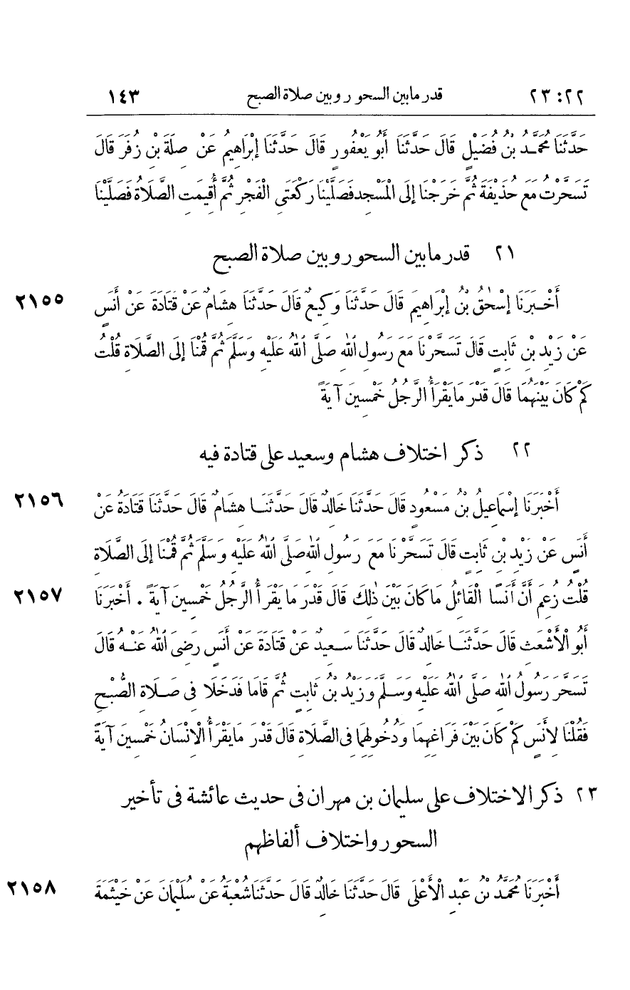2157 - أَخْبَرَنَا أَبُو الْأَشْعَثِ، قَالَ: حَدَّثَنَا خَالِدٌ، قَالَ: حَدَّثَنَا سَعِيدٌ، عَنْ قَتَادَةَ، عَنْ أَنَسٍ، رَضِيَ اللَّهُ عَنْهُ قَالَ: «§تَسَحَّرَ رَسُولُ اللَّهِ صَلَّى اللهُ عَلَيْهِ وَسَلَّمَ وَزَيْدُ بْنُ ثَابِتٍ، ثُمَّ قَامَا فَدَخَلَا فِي صَلَاةِ الصُّبْحِ»، فَقُلْنَا لِأَنَسٍ: كَمْ كَانَ بَيْنَ فَرَاغِهِمَا وَدُخُولِهِمَا فِي الصَّلَاةِ؟ قَالَ: قَدْرُ مَا يَقْرَأُ الْإِنْسَانُ خَمْسِينَ آيَةً