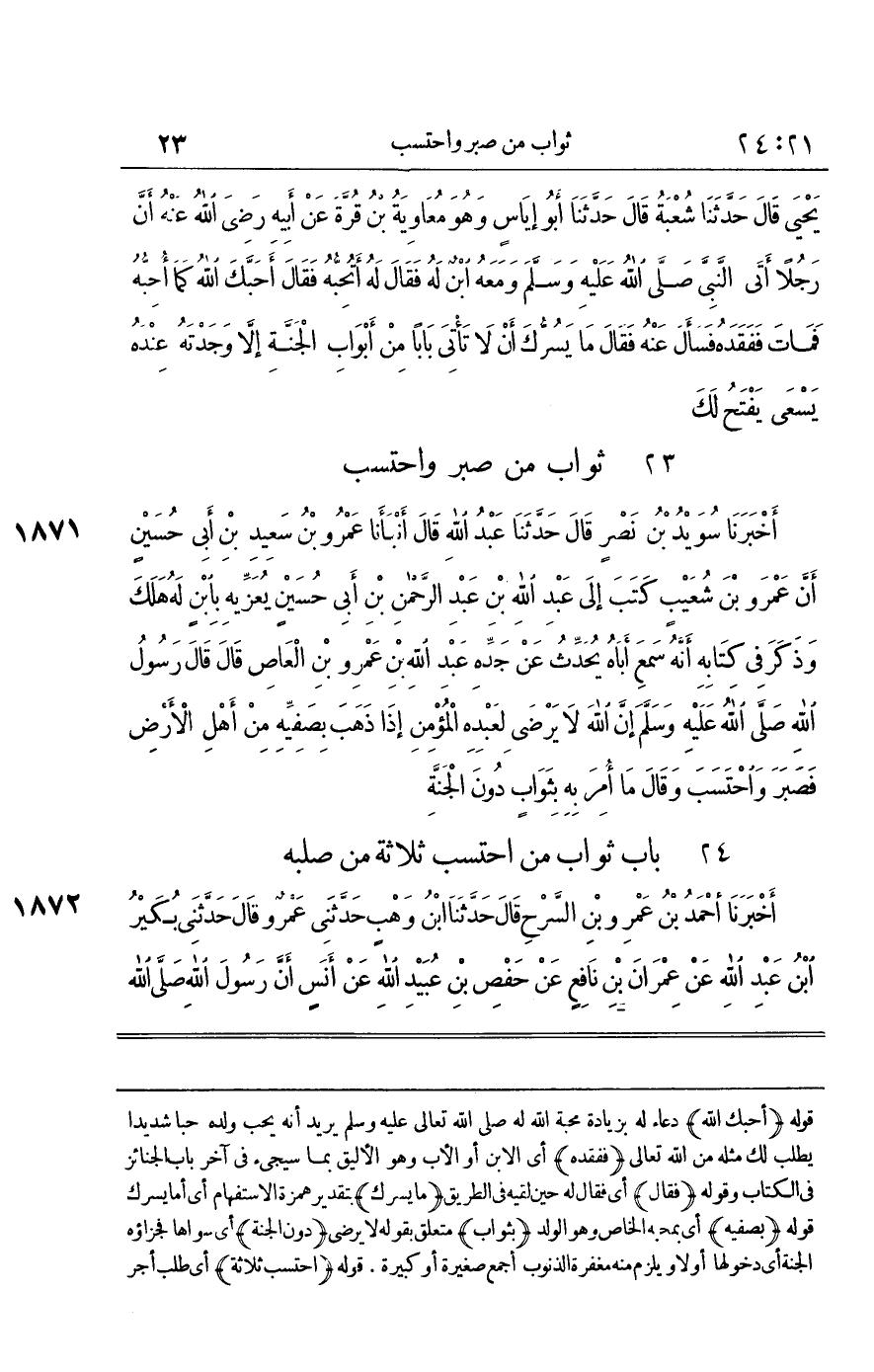 [1870] أحبك الله دُعَاء لَهُ بِزِيَادَة محبَّة الله لَهُ صلى الله تَعَالَى عَلَيْهِ وَسلم يُرِيد أَنه يحب وَلَده حبا شَدِيدا يطْلب لَك مثله من الله تَعَالَى فَفَقدهُ أَي الابْن أَو الْأَب وَهُوَ الْأَلْيَق بِمَا سَيَجِيءُ فِي آخر بَاب الْجَنَائِز فِي الْكتاب وَقَوله فَقَالَ أَي فَقَالَ لَهُ حِين لقِيه فِي الطَّرِيق مَا يَسُرك بِتَقْدِير همزَة الِاسْتِفْهَام أَي أما يَسُرك قَوْله بصفيه أَي بمحبه الْخَاص وَهُوَ الْوَلَد بِثَوَاب مُتَعَلق بقوله لَا يرضى دون الْجنَّة أَي سواهَا فَجَزَاؤُهُ الْجنَّة أَي دُخُولهَا أَولا وَيلْزم مِنْهُ مغْفرَة الذُّنُوب أجمع صَغِيرَة أَو كَبِيرَة