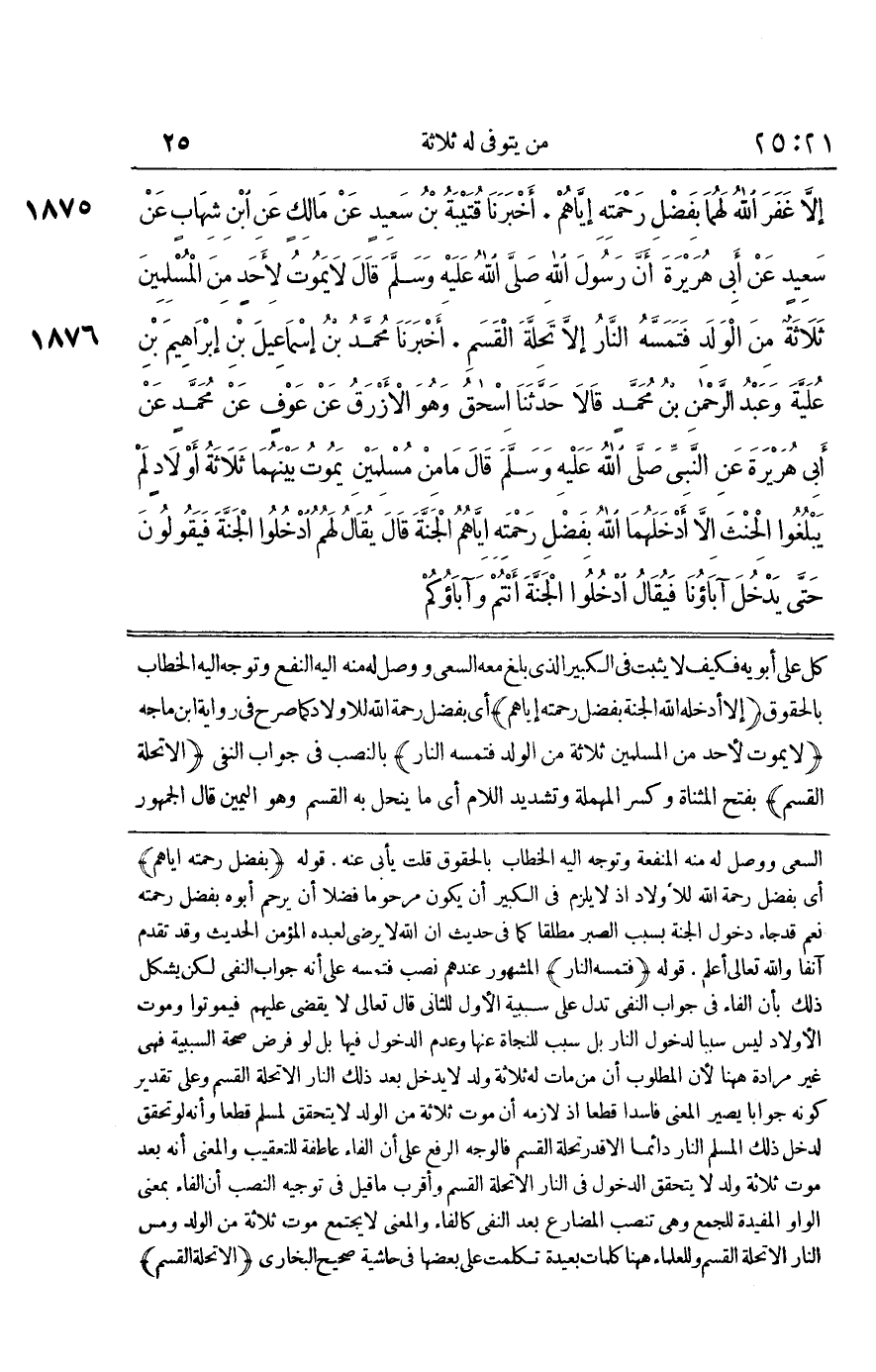 [1875] لَا يَمُوتُ لِأَحَدٍ مِنَ الْمُسْلِمِينَ ثَلَاثَةٌ مِنَ الْوَلَدِ فَتَمَسَّهُ النَّارُ بِالنَّصْبِ فِي جَوَابِ النَّفْيِ إِلَّا تَحِلَّةَ الْقَسَمِ بِفَتْحِ الْمُثَنَّاةِ وَكَسْرِ الْمُهْمَلَةِ وَتَشْدِيدِ اللَّامِ أَيْ مَا يَنْحَلُّ بِهِ الْقَسَمُ وَهُوَ الْيَمِينُ قَالَ الْجُمْهُورُ وَالْمُرَادُ بِذَلِكَ قَوْلُهُ تَعَالَى وَإِن مِنْكُم الا واردها قَالَ الْخَطَّابِيُّ مَعْنَاهُ لَا يَدْخُلُ النَّارَ لِيُعَاقَبَ بِهَا وَلَكِنَّهُ يَدْخُلُهَا مُجْتَازًا وَلَا يَكُونُ ذَلِكَ الْجَوَازُ إِلَّا قَدْرَ مَا تُحَلَّلُ بِهِ الْيَمِينُ وَقيل لم يعن بِهِ قسم بِعَيْنِهِ وَإِنَّمَا مَعْنَاهُ التَّقْلِيلُ لِأَمْرِ وُرُودِهَا وَهَذَا اللَّفْظُ يُسْتَعْمَلُ فِي هَذَا تَقُولُ مَا يَنَامُ فلَان الا كتحليل الآلية وَتقول مَا ضرّ بِهِ إِلَّا تَحْلِيلًا إِذَا لَمْ يُبَالِغْ فِي الضَّرْبِ الا قدرا يُصِيبهُ مِنْهُ مَكْرُوه