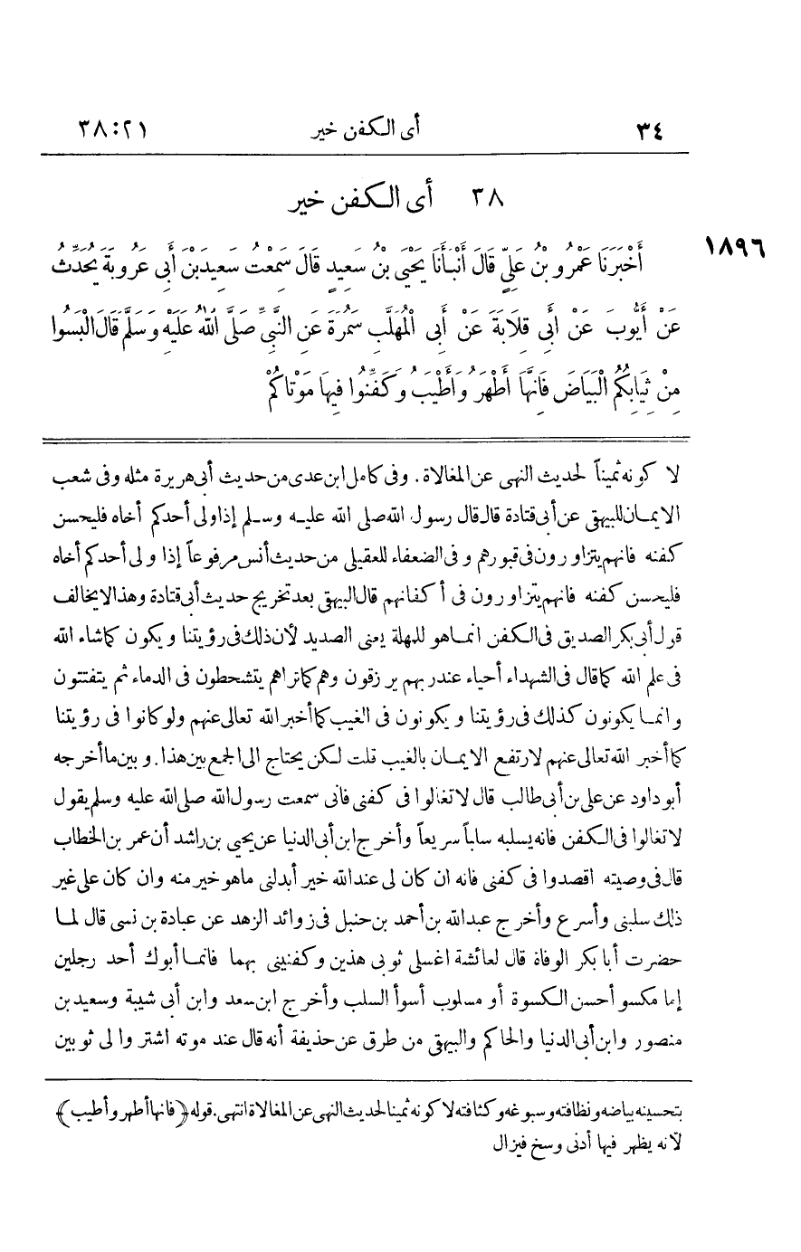 لَا كَوْنُهُ ثَمِينًا لِحَدِيثِ النَّهْيِ عَنِ الْمُغَالَاةِ وَفِي كَامِل بن عَدِيٍّ مِنْ حَدِيثِ أَبِي هُرَيْرَةَ مِثْلُهُ وَفِي شُعَبِ الْإِيمَانِ لِلْبَيْهَقِيِّ عَنْ أَبِي قَتَادَةَ قَالَ قَالَ رَسُولُ اللَّهِ صَلَّى اللَّهُ عَلَيْهِ وَسلم إِذَا وَلِيَ أَحَدُكُمْ أَخَاهُ فَلْيُحَسِّنْ كَفَنَهُ فَإِنَّهُمْ يَتَزَاوَرُونَ فِي قُبُورِهِمْ وَفِي الضُّعَفَاءِ لِلْعُقَيْلِيِّ مِنْ حَدِيثِ أَنَسٍ مَرْفُوعًا إِذَا وَلِيَ أَحَدُكُمْ أَخَاهُ فَلْيُحَسِّنْ كَفَنَهُ فَإِنَّهُمْ يَتَزَاوَرُونَ فِي أَكْفَانِهِمْ قَالَ الْبَيْهَقِيُّ بَعْدَ تَخْرِيجِ حَدِيثِ أَبِي قَتَادَةَ وَهَذَا لَا يُخَالِفُ قَوْلَ أَبِي بَكْرٍ الصِّدِّيقِ فِي الْكَفَنِ إِنَّمَا هُوَ لِلْمُهْلَةِ يَعْنِي الصَّدِيدَ لِأَنَّ ذَلِكَ فِي رُؤْيَتِنَا وَيَكُونُ كَمَا شَاءَ اللَّهُ فِي عِلْمِ اللَّهِ كَمَا قَالَ فِي الشُّهَدَاءِ أَحيَاء عِنْد رَبهم يرْزقُونَ وَهُمْ كَمَا تَرَاهُمْ يَتَشَحَّطُونَ فِي الدِّمَاءِ ثُمَّ يَتَفَتَّتُونَ وَإِنَّمَا يَكُونُونَ كَذَلِكَ فِي رُؤْيَتِنَا وَيَكُونُونَ فِي الْغَيْبِ كَمَا أَخْبَرَ اللَّهُ تَعَالَى عَنْهُمْ وَلَوْ كَانُوا فِي رُؤْيَتِنَا كَمَا أَخْبَرَ اللَّهُ تَعَالَى عَنْهُمْ لَارْتَفَعَ الْإِيمَانُ بِالْغَيْبِ قُلْتُ لَكِنْ يَحْتَاجُ إِلَى الْجَمْعِ بَيْنَ هَذَا وَبَيْنَ مَا أَخْرَجَهُ أَبُو دَاوُدَ عَنْ عَلِيِّ بْنِ أَبِي طَالِبٍ قَالَ لَا تُغَالُوا فِي كَفَنِي فَإِنِّي سَمِعْتُ رَسُولَ اللَّهِ صَلَّى اللَّهُ عَلَيْهِ وَسلم يَقُولُ لَا تُغَالُوا فِي الْكَفَنِ فَإِنَّهُ يُسْلَبُهُ سلبا سَرِيعا وَأخرج بن أَبِي الدُّنْيَا عَنْ يَحْيَى بْنِ رَاشِدٍ أَنَّ عُمَرَ بْنَ الْخَطَّابِ قَالَ فِي وَصِيَّتِهِ اقْصِدُوا فِي كَفَنِي فَإِنَّهُ إِنْ كَانَ لِي عِنْدَ اللَّهِ خَيْرٌ أَبْدَلَنِي مَا هُوَ خَيْرٌ مِنْهُ وَإِنْ كَانَ عَلَيَّ غَيْرُ ذَلِكَ سَلَبَنِي وَأَسْرَعَ وَأَخْرَجَ عَبْدُ اللَّهِ بْنُ أَحْمَدَ بْنِ حَنْبَلٍ فِي زَوَائِدِ الزُّهْدِ عَنْ عُبَادَةَ بْنِ نُسَيٍّ قَالَ لَمَّا حَضَرَتْ أَبَا بَكْرٍ الْوَفَاةُ قَالَ لِعَائِشَةَ اغْسِلِي ثَوْبَيَّ هَذَيْنِ وَكَفِّنِينِي بِهِمَا فَإِنَّمَا أَبُوكِ أَحَدَ رَجُلَيْنِ إِمَّا مَكْسُوٌّ أَحْسَنَ الْكُسْوَةِ أَو مسلوب أَسْوَأ السَّلب وَأخرج بن سعد وبن أبي شيبَة وَسَعِيد بن مَنْصُور وبن أَبِي الدُّنْيَا وَالْحَاكِمُ وَالْبَيْهَقِيُّ مِنْ طُرُقٍ عَنْ حُذَيْفَةَ أَنَّهُ قَالَ عِنْدَ مَوْتِهِ اشْتَرُوا لِي ثَوْبَيْنِ