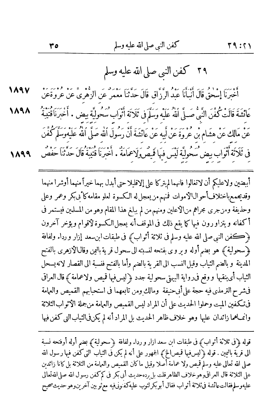 [1898] لَيْسَ فِيهَا قَمِيصٌ وَلَا عِمَامَةٌ قَالَ الْعِرَاقِيُّ فِي شَرْحِ التِّرْمِذِيِّ فِيهِ حُجَّةٌ عَلَى أَبِي حَنِيفَةَ وَمَالِكٍ وَمَنْ تَابَعَهُمَا فِي اسْتِحْبَابِهِمُ الْقَمِيصَ وَالْعِمَامَةَ فِي تَكْفِينِ الْمَيِّتِ وَحَمَلُوا الْحَدِيثَ عَلَى أَنَّ الْمُرَادَ لَيْسَ الْقَمِيصُ وَالْعِمَامَةُ مِنْ جُمْلَةِ الْأَثْوَابِ الثَّلَاثَةِ وَإِنَّمَا هُمَا زَائِدَانِ عَلَيْهَا وَهُوَ خِلَافُ ظَاهِرِ الْحَدِيثِ بَلِ الْمُرَادُ أَنَّهُ لَمْ يَكُنْ فِي الثِّيَابِ الَّتِي كُفِّنَ فِيهَا