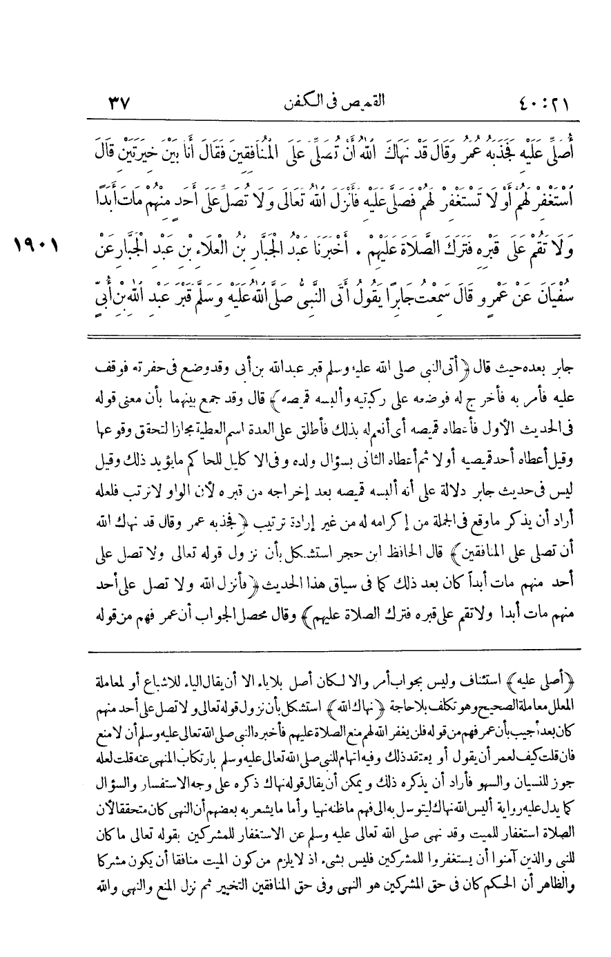 جَابِرٍ بَعْدَهُ حَيْثُ قَالَ أَتَى النَّبِيُّ صَلَّى اللَّهُ عَلَيْهِ وَسَلَّمَ قَبْرَ عَبْدِ اللَّهِ بْنِ أبي وَقد وضع فِي حفرته فَوقف عَلَيْهِ فَأمر بِهِ فَأخْرج لَهُ فَوَضعه على رُكْبَتَيْهِ وَألبَسَهُ قَمِيصَهُ قَالَ وَقَدْ جُمِعَ بَيْنَهُمَا بِأَنَّ مَعْنَى قَوْلِهِ فِي الْحَدِيثِ الْأَوَّلِ فَأَعْطَاهُ قَمِيصَهُ أَيْ أَنْعَمَ لَهُ بِذَلِكَ فَأُطْلِقَ عَلَى الْعِدَةِ اسْمُ الْعَطِيَّةِ مَجَازًا لِتَحَقُّقِ وُقُوعِهَا وَقِيلَ أَعْطَاهُ أَحَدُ قَمِيصَيْهِ أَوَّلًا ثُمَّ أَعْطَاهُ الثَّانِي بِسُؤَالِ وَلَده وَفِي الا كليل لِلْحَاكِمِ مَا يُؤَيِّدُ ذَلِكَ وَقِيلَ لَيْسَ فِي حَدِيثِ جَابِرٍ دَلَالَةٌ عَلَى أَنَّهُ أَلْبَسَهُ قَمِيصَهُ بَعْدَ إِخْرَاجِهِ مِنْ قَبْرِهِ لِأَنَّ الْوَاوَ لَا تُرَتِّبُ فَلَعَلَّهُ أَرَادَ أَنْ يَذْكُرَ مَا وَقَعَ فِي الْجُمْلَةِ مِنْ إِكْرَامِهِ لَهُ مِنْ غَيْرِ إِرَادَةِ تَرْتِيبٍ فَجَذَبَهُ عُمَرُ وَقَالَ قَدْ نَهَاكَ اللَّهُ أَنْ تُصَلِّيَ عَلَى الْمُنَافِقِينَ قَالَ الْحَافِظُ بن حَجَرٍ اسْتُشْكِلَ بِأَنَّ نُزُولَ قَوْلِهِ تَعَالَى وَلَا تصل على أحد مِنْهُم مَاتَ أبدا كَانَ بَعْدَ ذَلِكَ كَمَا فِي سِيَاقِ هَذَا الْحَدِيثِ فَأَنْزَلَ اللَّهُ وَلَا تُصَلِّ عَلَى أَحَدٍ مِنْهُمْ مَاتَ أَبَدًا وَلَا تَقُمْ عَلَى قَبْرِهِ فَتَرَكَ الصَّلَاةَ عَلَيْهِمْ وَقَالَ مُحَصِّلُ الْجَوَابِ أَنَّ عُمَرَ فَهِمَ مِنْ قَوْلِهِ