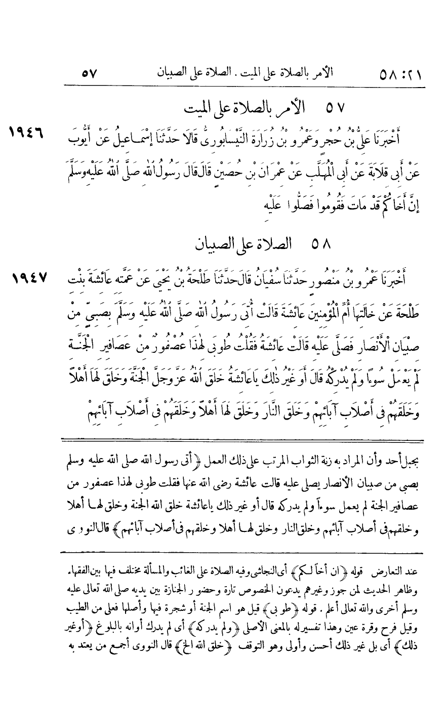 [1947] أَتَى رَسُول الله صلى الله عَلَيْهِ وَسلم بِصَبِيٍّ مِنْ صِبْيَانِ الْأَنْصَارِ يُصَلِّي عَلَيْهِ قَالَتْ عَائِشَةُ رَضِيَ اللَّهُ عَنْهَا فَقُلْتُ طُوبَى لِهَذَا عُصْفُورٌ مِنْ عَصَافِيرِ الْجَنَّةِ لَمْ يَعْمَلْ سُوءًا وَلَمْ يُدْرِكْهُ قَالَ أَوَ غَيْرَ ذَلِكَ يَا عَائِشَةُ خَلَقَ اللَّهُ الْجَنَّةَ وَخَلَقَ لَهَا أَهْلًا وَخَلَقَهُمْ فِي أَصْلَابِ آبَائِهِمْ وَخَلَقَ النَّارَ وَخَلَقَ لَهَا أَهْلًا وَخَلَقَهُمْ فِي أَصْلَابِ آبَائِهِمْ قَالَ النَّوَوِيُّ أَجْمَعَ مَنْ يُعْتَدُّ بِهِ مِنْ عُلَمَاءِ الْمُسْلِمِينَ عَلَى أَنَّ مَنْ مَاتَ مِنْ أَطْفَالِ الْمُسْلِمِينَ فَهُوَ مِنْ أَهْلِ الْجَنَّةِ وَالْجَوَابُ عَنْ هَذَا الْحَدِيثِ أَنَّهُ لَعَلَّهُ نَهَاهَا عَنِ الْمُسَارَعَةِ إِلَى الْقَطْعِ مِنْ غَيْرِ دَلِيلٍ أَوْ قَالَ ذَلِكَ قَبْلَ أَنْ يَعْلَمَ أَنَّ أَطْفَالَ الْمُسْلِمِينَ فِي الْجنَّة