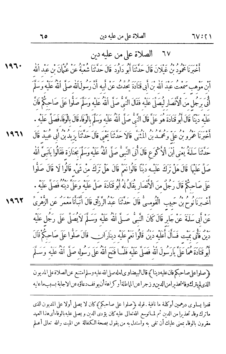 [1960] صَلُّوا عَلَى صَاحِبِكُمْ فَإِنَّ عَلَيْهِ دَيْنًا قَالَ الْبَيْضَاوِيُّ لَعَلَّهُ صَلَّى اللَّهُ عَلَيْهِ وَسَلَّمَ امْتَنَعَ عَنِ الصَّلَاةِ عَلَى الْمَدْيُونِ الَّذِي لَمْ يَتْرُكْ وَفَاءً تَحْذِيرًا مِنَ الدَّيْنِ وَزَجْرًا عَنِ الْمُمَاطَلَةِ أَوْ كَرَاهَةَ أَنْ يُوقَفَ دُعَاؤُهُ عَنِ الْإِجَابَةِ بِسَبَب مَا عَلَيْهِ من مظْلمَة الْخلق