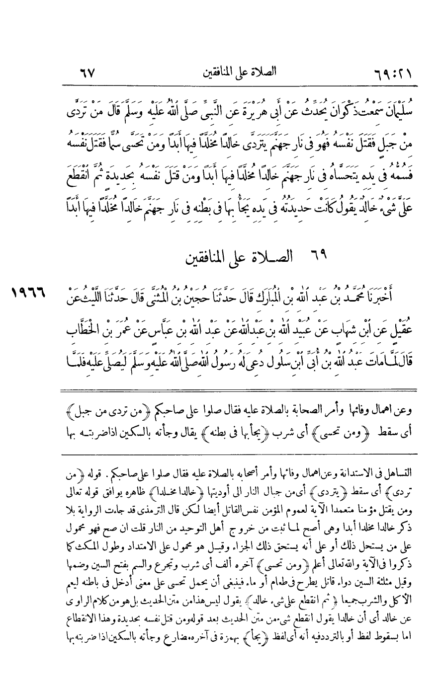 [1965] مَنْ تَرَدَّى مِنْ جَبَلٍ أَيْ سَقَطَ وَمَنْ تَحَسَّى أَيْ شَرِبَ يَجَأُ بِهَا فِي بَطْنِهِ يُقَال وجأته بالسكين إِذا ضَربته بهَا