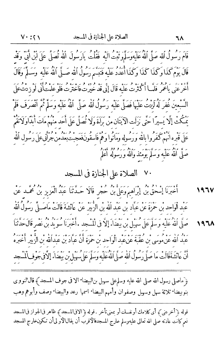 [1968] مَا صَلَّى رَسُولُ اللَّهِ صَلَّى اللَّهُ عَلَيْهِ وَسَلَّمَ عَلَى سُهَيْلِ بْنِ الْبَيْضَاءِ إِلَّا فِي جَوْفِ الْمَسْجِدِ قَالَ النَّوَوِيُّ بَنُو بَيْضَاءَ ثَلَاثَةٌ سَهْلٌ وَسُهَيْلٌ وَصَفْوَانُ وَأُمُّهُمُ الْبَيْضَاءُ اسْمُهَا رَعْدٌ وَالْبَيْضَاءُ وَصْفٌ وَأَبُوهُمْ وَهْبُ بْنُ رَبِيعَةَ الْقُرَشِيُّ الْفِهْرِيُّ وَكَانَ سُهَيْلٌ قَدِيمَ الْإِسْلَامِ هَاجَرَ إِلَى الْحَبَشَةِ ثُمَّ عَادَ إِلَى مَكَّةَ ثُمَّ هَاجَرَ إِلَى الْمَدِينَةِ وَشَهِدَ بَدْرًا وَغَيْرَهَا تُوُفِّيَ سَنَةَ تسع من الْهِجْرَة