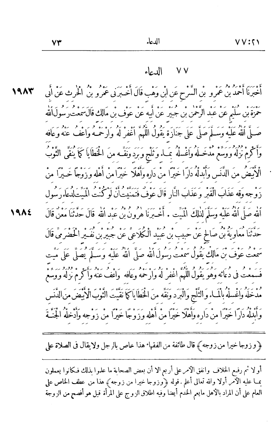 [1983] وَزَوْجًا خَيْرًا مِنْ زَوْجِهِ قَالَ طَائِفَةٌ مِنَ الْفُقَهَاءِ هَذَا خَاصٌّ بِالرَّجُلِ وَلَا يُقَالُ فِي الصَّلَاةِ عَلَى الْمَرْأَةِ أَبْدِلْهَا زَوْجًا خَيْرًا مِنْ زَوْجِهَا لِجَوَازِ أَنْ تَكُونَ لِزَوْجِهَا فِي الْجَنَّةِ فَإِنَّ الْمَرْأَةَ لَا يُمْكِنُ الِاشْتِرَاكُ فِيهَا وَالرَّجُلُ يقبل ذَلِك قَوْلُهُ وَجَلَسْنَا حَوْلَهُ كَأَنَّ عَلَى رُءُوسِنَا الطَّيْرَ قَالَ فِي النِّهَايَةِ مَعْنَاهُ وَصْفُهُمْ بِالسُّكُونِ وَالْوَقَارِ وَأَنَّهُمْ لَمْ يَكُنْ فِيهِمْ طَيْشٌ وَلَا خِفَّةٌ لِأَنَّ الطَّيْرَ لَا تَكَادُ تَقَعُ إِلَّا عَلَى شَيْء سَاكن زَمِّلُوهُمْ بِدِمَائِهِمْ أَيْ لُفُّوهُمْ كَلْمٌ هُوَ الْجُرْحُ عَن بن عَبَّاسٍ قَالَ جَعَلْتُ تَحْتَ رَسُولِ اللَّهِ صَلَّى اللَّهُ عَلَيْهِ وَسَلَّمَ حِينَ دُفِنَ قَطِيفَةً حَمْرَاءَ زَاد بن سعد
