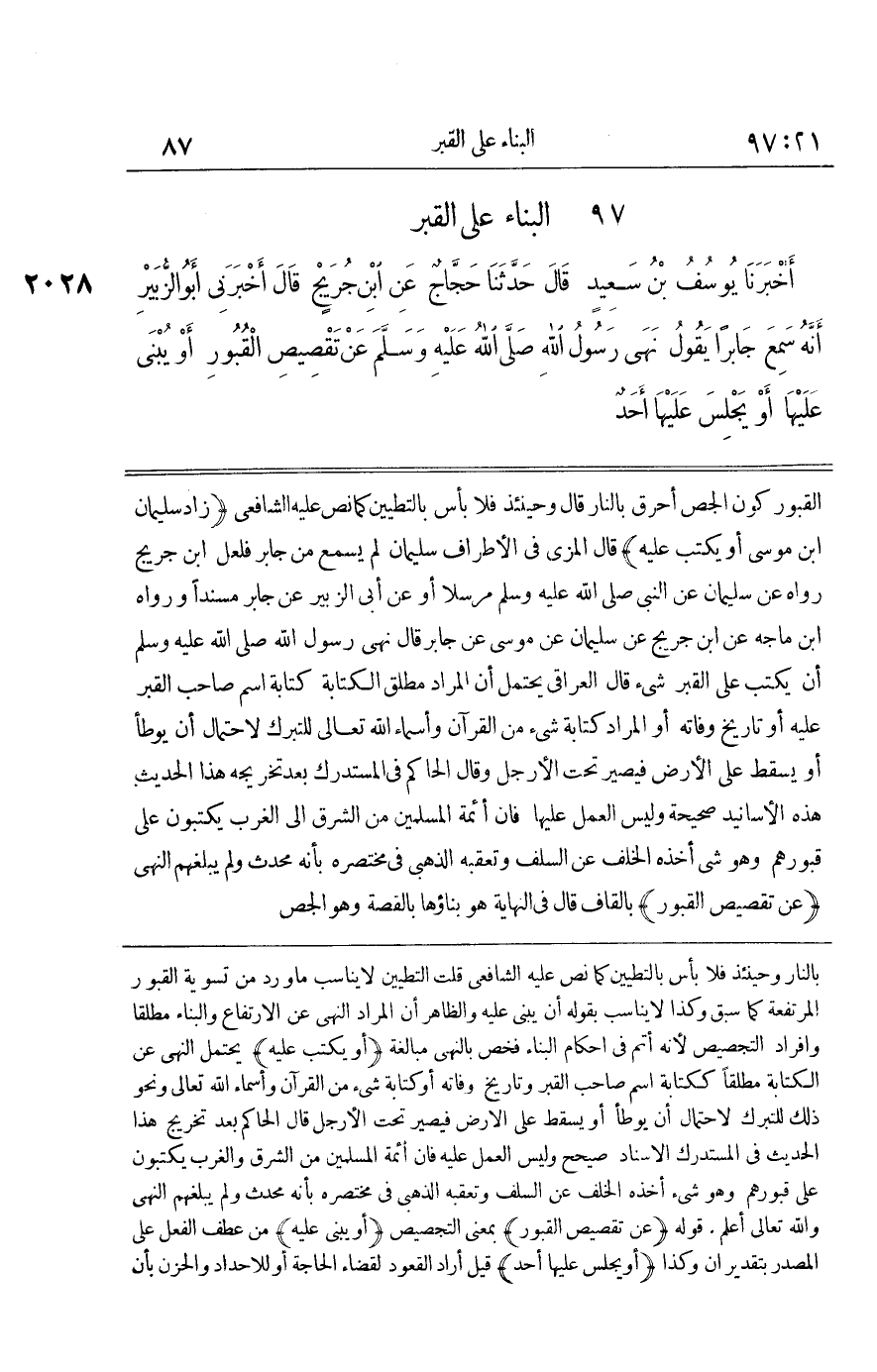 [75] 2001 - الْقُبُورِ كَوْنُ الْجِصِّ أُحْرِقَ بِالنَّارِ قَالَ وَحِينَئِذٍ فَلَا بَأْسَ بِالتَّطْيِينِ كَمَا نَصَّ عَلَيْهِ الشَّافِعِيُّ زَادَ سُلَيْمَانُ بْنُ مُوسَى أَوْ يُكْتَبَ عَلَيْهِ قَالَ الْمِزِّيُّ فِي الْأَطْرَافِ سُلَيْمَانُ لَمْ يَسْمَعْ من جَابر فَلَعَلَّ بن جُرَيْجٍ رَوَاهُ عَنْ سُلَيْمَانَ عَنِ النَّبِيِّ صَلَّى اللَّهُ عَلَيْهِ وَسَلَّمَ مُرْسَلًا أَوْ عَنْ أَبِي الزبير عَن جَابر مُسْندًا وَرَوَاهُ بن ماجة عَن بن جُرَيْجٍ عَنْ سُلَيْمَانَ عَنْ مُوسَى عَنْ جَابِرٍ قَالَ نَهَى رَسُولُ اللَّهِ صَلَّى اللَّهُ عَلَيْهِ وَسَلَّمَ أَنْ يُكْتَبَ عَلَى الْقَبْرِ شَيْءٌ قَالَ الْعِرَاقِيُّ يَحْتَمِلُ أَنَّ الْمُرَادَ مُطْلَقُ الْكِتَابَةِ كِتَابَةُ اسْمِ صَاحِبِ الْقَبْرِ عَلَيْهِ أَوْ تَارِيخِ وَفَاتِهِ أَوِ الْمُرَادُ كِتَابَةُ شَيْءٍ مِنَ الْقُرْآنِ وَأَسْمَاءِ اللَّهِ تَعَالَى لِلتَّبَرُّكِ لِاحْتِمَالِ أَنْ يُوطَأَ أَوْ يَسْقُطَ عَلَى الْأَرْضِ فَيَصِيرَ تَحْتَ الْأَرْجُلِ وَقَالَ الْحَاكِمُ فِي الْمُسْتَدْرَكِ بَعْدَ تَخْرِيجِهِ هَذَا الْحَدِيثَ هَذِهِ الْأَسَانِيدُ صَحِيحَةٌ وَلَيْسَ الْعَمَلُ عَلَيْهَا فَإِنَّ أَئِمَّةَ الْمُسْلِمِينَ مِنَ الشَّرْقِ إِلَى الْغَرْبِ يَكْتُبُونَ عَلَى قُبُورِهِمْ وَهُوَ شَيْءٌ أَخَذَهُ الْخَلَفُ عَنِ السَّلَفِ وَتَعَقَّبَهُ الذَّهَبِيُّ فِي مُخْتَصَرِهِ بِأَنَّهُ مُحْدَثٌ وَلم يبلغهم النَّهْي