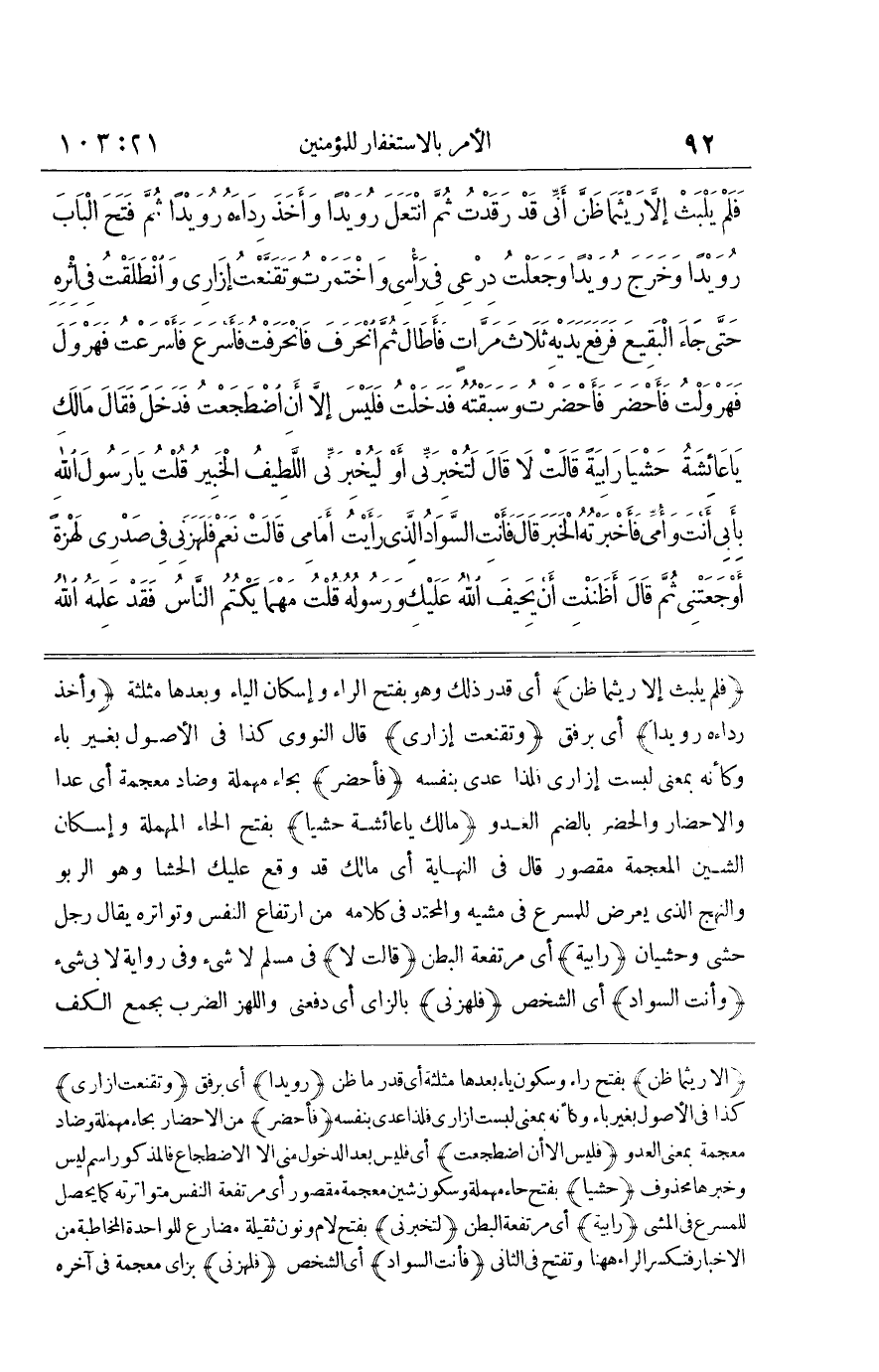 الا ريثما ظن بِفَتْح رَاء وَسُكُون يَاء بعْدهَا مُثَلّثَة أَي قدر مَا ظن رويدا أَي بِرِفْق وتقنعت ازاري كَذَا فِي الْأُصُولِ بِغَيْرِ بَاءٍ وَكَأَنَّهُ بِمَعْنَى لبست ازاري فَلِذَا عدي بِنَفسِهِ فأحضر من الاحضار بحاء مُهْملَة وضاد مُعْجمَة بِمَعْنى الْعَدو فَلَيْسَ الا أَن اضطجعت أَي فَلَيْسَ بعد الدُّخُول مني الا الِاضْطِجَاع فالمذكور اسْم لَيْسَ وخبرها مَحْذُوف حشيا بِفَتْح حاء مُهْملَة وَسُكُون شين مُعْجمَة مَقْصُور أَي مُرْتَفعَة النَّفس متواترته كَمَا يحصل للمسرع فِي الْمَشْي رابية أَي مُرْتَفعَة الْبَطن لتخبرني بِفَتْح لَام وَنون ثَقيلَة مضارع للواحدة المخاطبة من الاخبار فتكسر الرَّاء هَا هُنَا وتفتح فِي الثَّانِي فَأَنت السوَاد أَي الشَّخْص فلهزني بزاي مُعْجمَة فِي آخِره