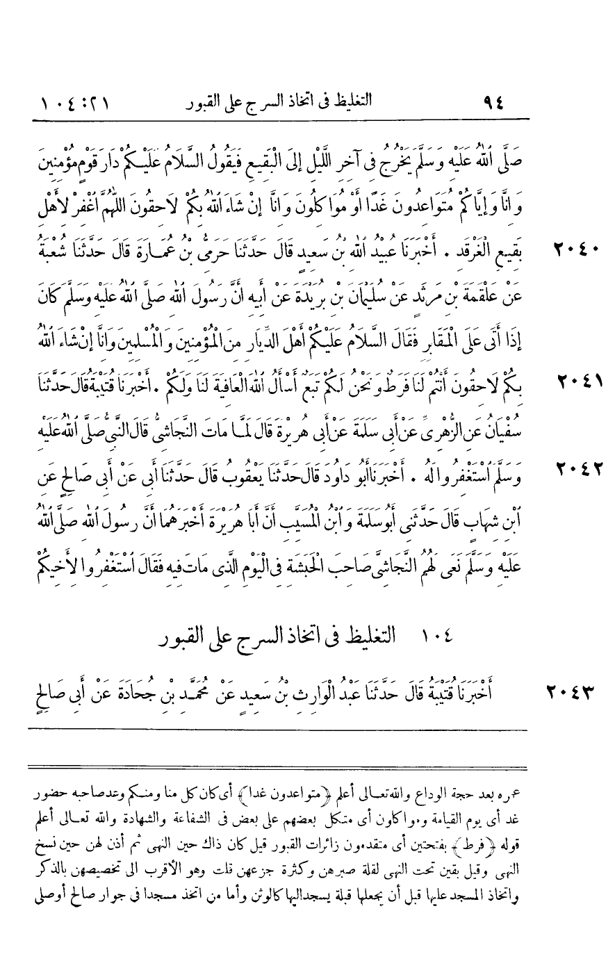 [2039] كلما كَانَت لَيْلَتهَا أَي فِي آخر عمره بعد حجَّة الْوَدَاع وَالله تَعَالَى أعلم متواعدون غَدا أَي كَانَ كل منا ومنكم وعد صَاحبه حُضُور غَد أَي يَوْم الْقِيَامَة ومواكلون أَي متكل بَعضهم على بعض فِي الشَّفَاعَة وَالشَّهَادَة وَالله تَعَالَى أعلم قَوْله فرط بِفتْحَتَيْنِ أَي متقدمون زائرات الْقُبُور قيل كَانَ ذَاك حِين النَّهْي ثمَّ أذن لَهُنَّ حِين نسخ النَّهْي وَقيل بَقينَ تَحت النَّهْي لقلَّة صبرهن وَكَثْرَة جزعهن قلت وَهُوَ الْأَقْرَب إِلَى تخصيصهن بِالذكر واتخاذ الْمَسْجِد عَلَيْهَا قبل أَن يَجْعَلهَا قبْلَة يسْجد إِلَيْهَا كالوثن وَأما من اتخذ مَسْجِدا فِي جوَار صَالح أَو صلى