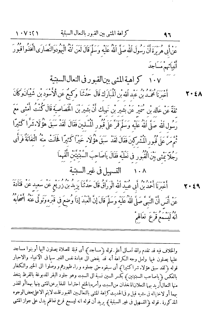 [2048] لقد سبق هَؤُلَاءِ شرا كثيرا أَي سَبَقُوهُ حَتَّى جَعَلُوهُ وَرَاء ظُهُورهمْ ووصلوا إِلَى الْخَيْر وَالْكفَّار بِالْعَكْسِ يَا صَاحب السبتيتين بِكَسْر السِّين نِسْبَة إِلَى السبت وَهُوَ جُلُود الْبَقر المدبوغة بالقرظ يتَّخذ مِنْهَا النِّعَال أُرِيد بهما النَّعْلَانِ المتخذان من السبت وَأمره بِالْخلْعِ احتراما للمقابر عَن الْمَشْي بَينهَا بهما أَو لقذر بهما أَو لاختياله فِي مَشْيه قيل وَفِي الحَدِيث كَرَاهَة الْمَشْي بالنعال بَين الْقُبُور قلت لَا يتم الا على بعض الْوُجُوه الْمَذْكُورَة قَوْله التسهيل فِي غير السبتية يُرِيد أَن قَوْله