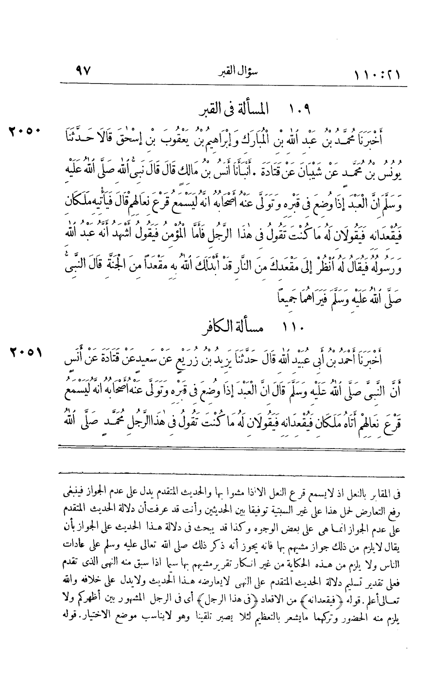 [2049] انه ليسمع قرع نعَالهمْ يدل على جَوَاز الْمَشْي فِي الْمَقَابِر بالنعل إِذْ لَا يسمع قرع النَّعْل إِلَّا إِذا مَشوا بهَا والْحَدِيث الْمُتَقَدّم يدل على عدم الْجَوَاز فَيَنْبَغِي رفع التَّعَارُض لحمل هَذَا على غير السبتية تَوْفِيقًا بَين الْحَدِيثين وَأَنت قد عرفت أَن دلَالَة الحَدِيث الْمُتَقَدّم على عدم الْجَوَاز إِنَّمَا هِيَ على بعض الْوُجُوه وَكَذَا قد يبْحَث فِي دلَالَة هَذَا الحَدِيث على الْجَوَاز بِأَن يُقَال لَا يلْزم من ذَلِك جَوَاز مشيهم بهَا فَإِنَّهُ يجوز أَنه ذكر ذَلِك صلى الله تَعَالَى عَلَيْهِ وَسلم على عادات النَّاس وَلَا يلْزم من هَذِه الْحِكَايَة من غير إِنْكَار تَقْرِير مشيهم بهَا سِيمَا إِذا سبق مِنْهُ النَّهْي الَّذِي تقدم فعلى تَقْدِير تَسْلِيم دلَالَة الحَدِيث الْمُتَقَدّم على النَّهْي لَا يُعَارضهُ هَذَا الحَدِيث وَلَا يدل علىخلافه وَالله تَعَالَى أعلم قَوْله فَيُقْعِدَانِهِ من الاقعاد