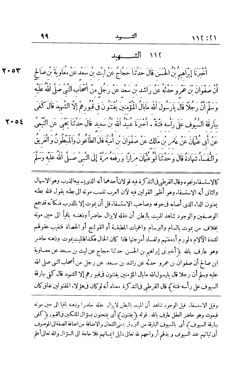 [2053] أَخْبَرَنِي إِبْرَاهِيمُ بْنُ الْحَسَنِ حَدَّثَنَا حَجَّاجِ عَنْ لَيْث بن سعد عَن مُعَاوِيَة بن صَالح أَنَّ صَفْوَانَ بْنَ عَمْرٍو حَدَّثَهُ عَنْ رَاشِدِ بْنِ سَعْدٍ عَنْ رَجُلٍ مِنْ أَصْحَابِ النَّبِيِّ صَلَّى اللَّهُ عَلَيْهِ وَسَلَّمَ أَنَّ رَجُلًا قَالَ يَا رَسُولَ اللَّهِ مَا بَالُ الْمُؤْمِنِينَ يُفْتَنُونَ فِي قُبُورِهِمْ إِلَّا الشَّهِيدُ قَالَ كَفَى بِبَارِقَةِ السُّيُوفِ عَلَى رَأْسِهِ فِتْنَةً قَالَ الْقُرْطُبِيُّ فِي التَّذْكِرَةِ مَعْنَاهُ أَنَّهُ لَوْ كَانَ فِي هَؤُلَاءِ الْمَقْتُولِينَ نِفَاقٌ كَانَ