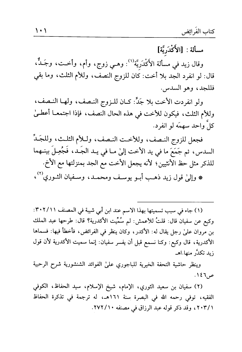 وقال زيد في مسألة الأكدرية: وهي زوج، وأم، وأخت، وجد.