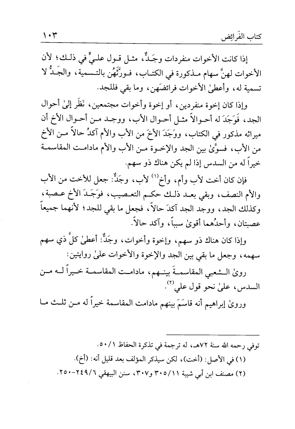 وإذا كان إخوة منفردين، أو إخوة وأخوات مجتمعين، نظر إلى أحوال الجد، فوجد له أحوالًا مثل أحوال الأب، ووجد من أحوال الأخ أن ميراثه مذكور في الكتاب، ووجد الأخ من الأب والأم آكد حالًا من الأخ من الأب، فسوى بين الجد والإخوة من الأب والأم ما دامت المقاسمة خيرًا له من السدس إذا لم يكن هناك ذو سهم.