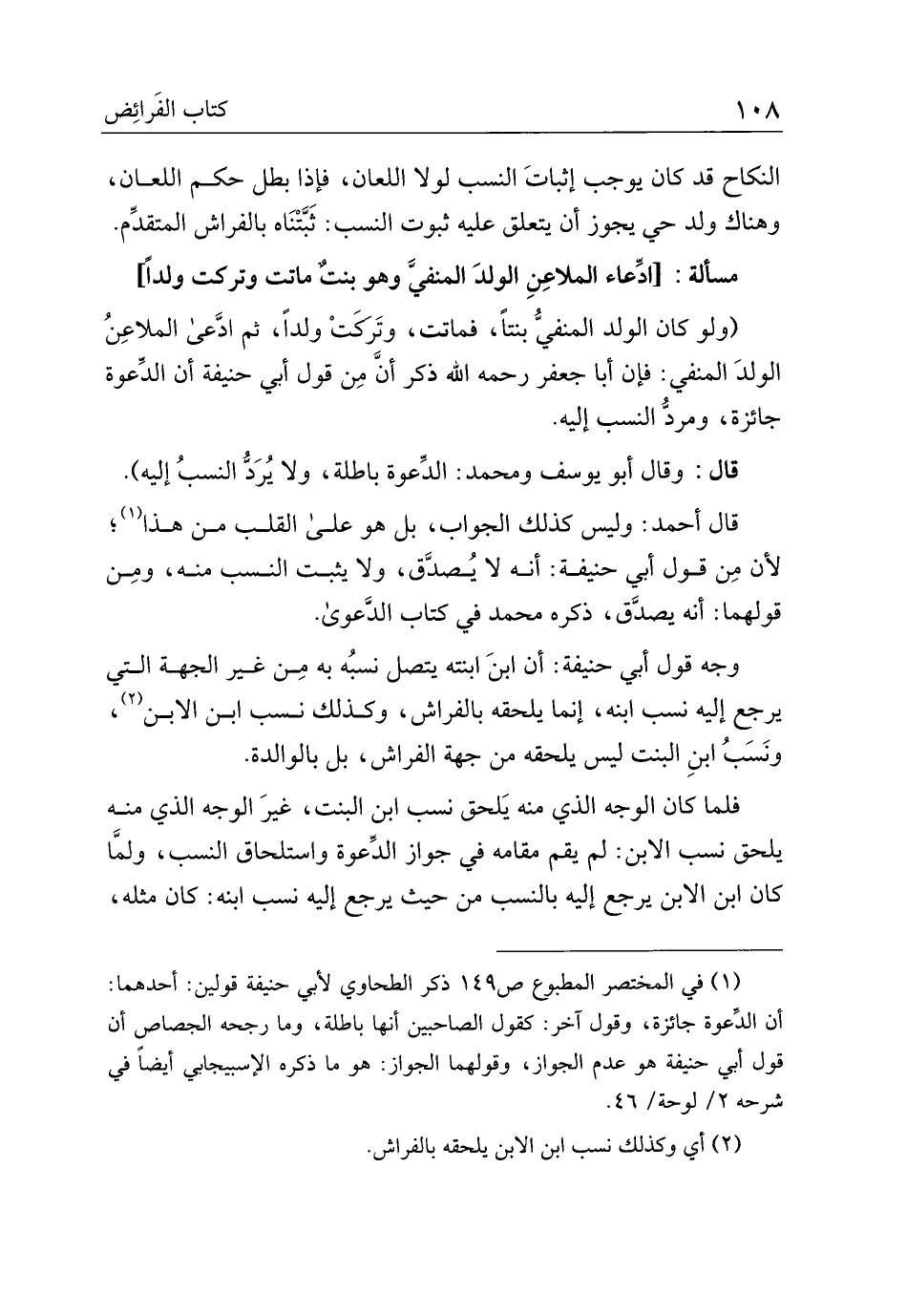 (ولو كان الولد المنفي بنتًا، فماتت، وتركت ولدًا، ثم ادعى الملاعن الولد المنفي: فإن أبا جعفر رحمه الله ذكر أن من قول أبي حنيفة أن الدعوة جائزة، ومرد النسب إليه.