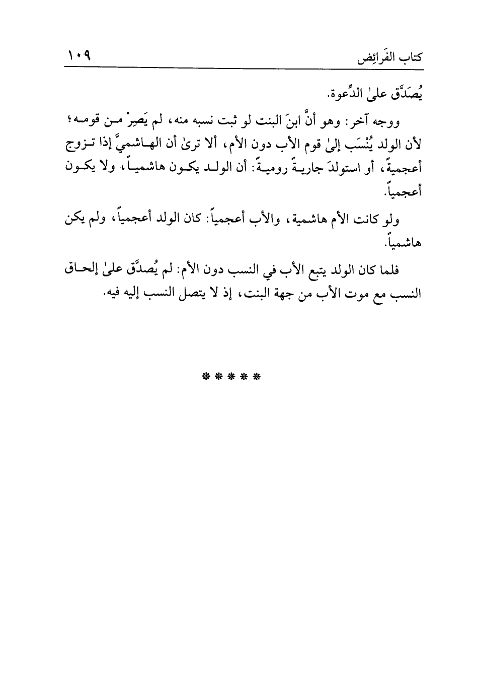 ووجه آخر: وهو أن ابن البنت لو ثبت نسبه منه، لم يصر من قومه؛ لأن الولد ينسب إلى قوم الأب دون الأم، ألا ترى أن الهاشمي إذا تزوج أعجمية، أو استولد جارية رومية: أن الولد يكون هاشميًا، ولا يكون أعجميًا.