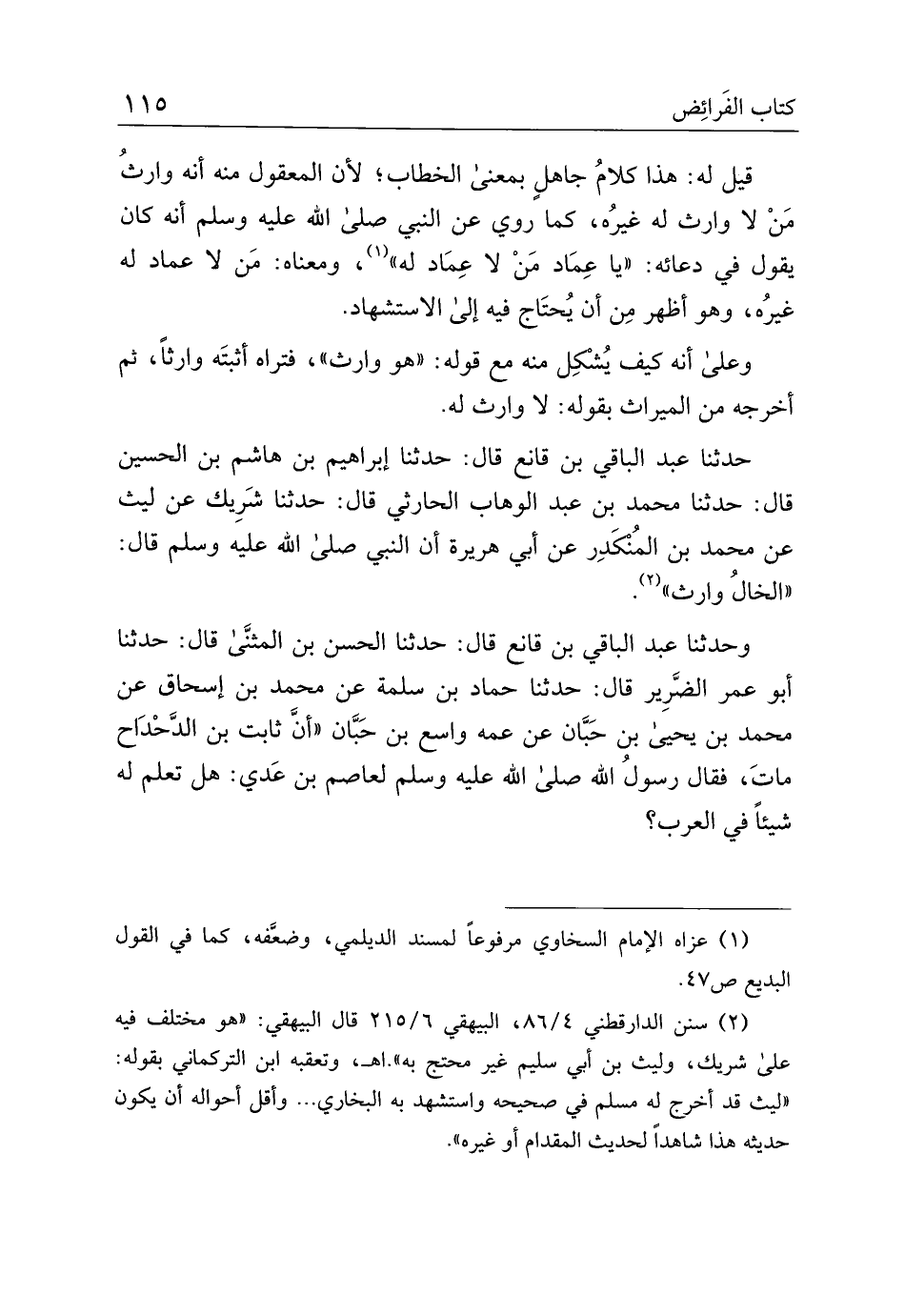 حدثنا عبد الباقي بن قانع قال: حدثنا إبراهيم بن هاشم بن الحسين قال: حدثنا محمد بن عبد الوهاب الحارثي قال: حدثنا شريك عن ليث عن محمد بن المنكدر عن أبي هريرة أن النبي صلى الله عليه وسلم قال: "الخال وارث".
