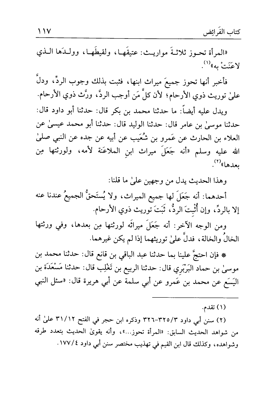 فأخبر أنها تحوز جميع ميراث ابنها، فثبت بذلك وجوب الرد، ودل على توريث ذوي الأرحام؛ لأن كل من أوجب الرد، ورث ذوي الأرحام.