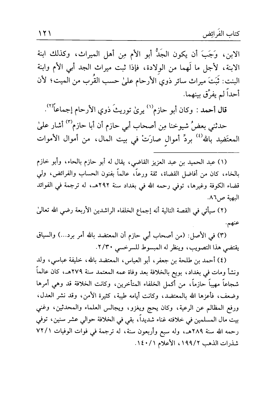 قال أحمد: وكان أبو حازم يرى توريث ذوي الأرحام إجماعًا حدثني بعض شيوخنا من أصحاب أبي حازم أن أبا حازم أشار على المعتضد بالله برد أموالٍ صارت في بيت المال، من أموال الأموات