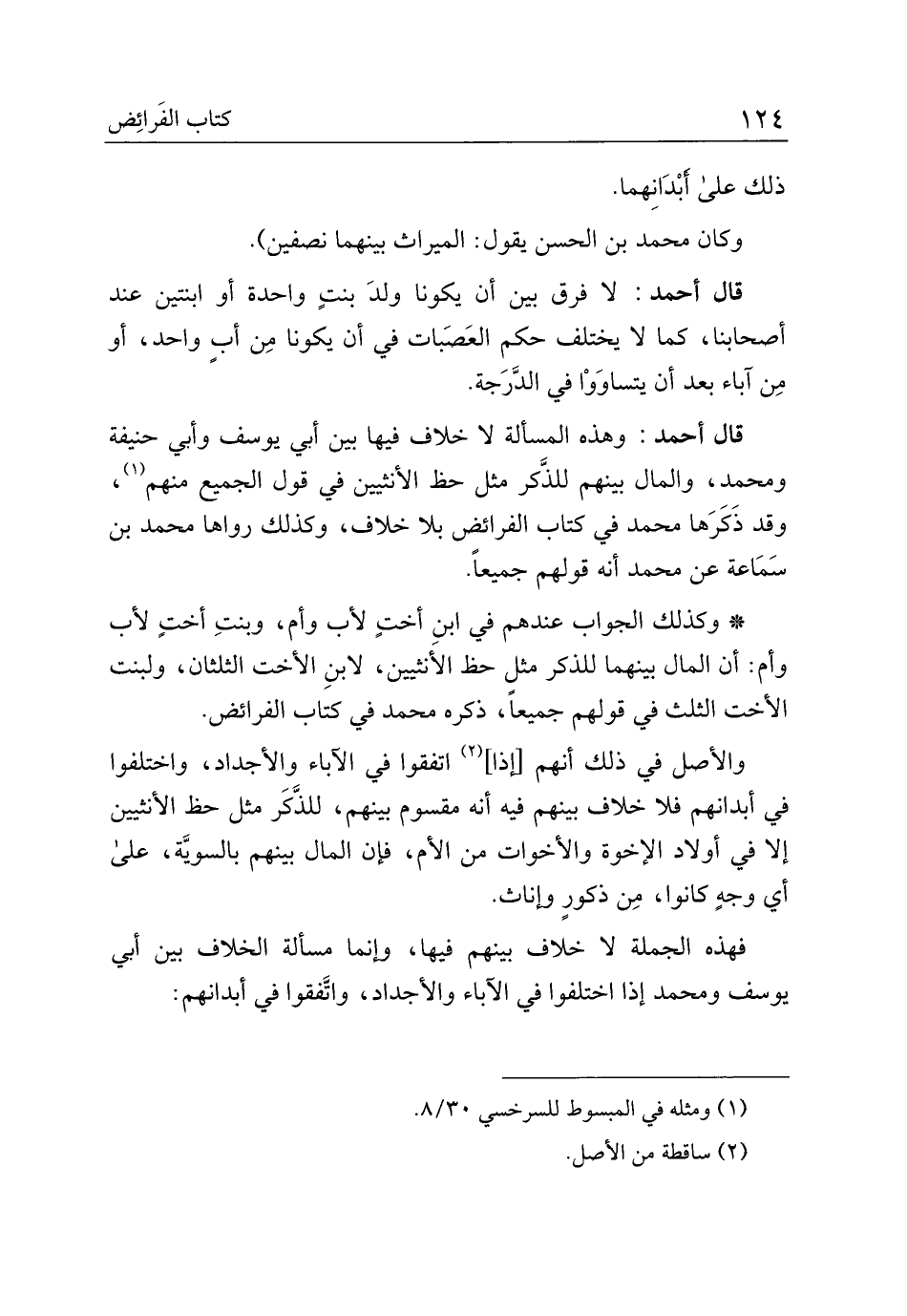 قال أحمد: وهذه المسألة لا خلاف فيها بين أبي يوسف وأبي حنيفة ومحمد، والمال بينهم لذكر مثل حظ الأنثيين في قول الجميع منهم، وقد ذكرها محمد في كتاب الفرائض بلا خلاف، وكذلك رواها محمد بن سماعة عن محمد أنه قولهم جميعًا.