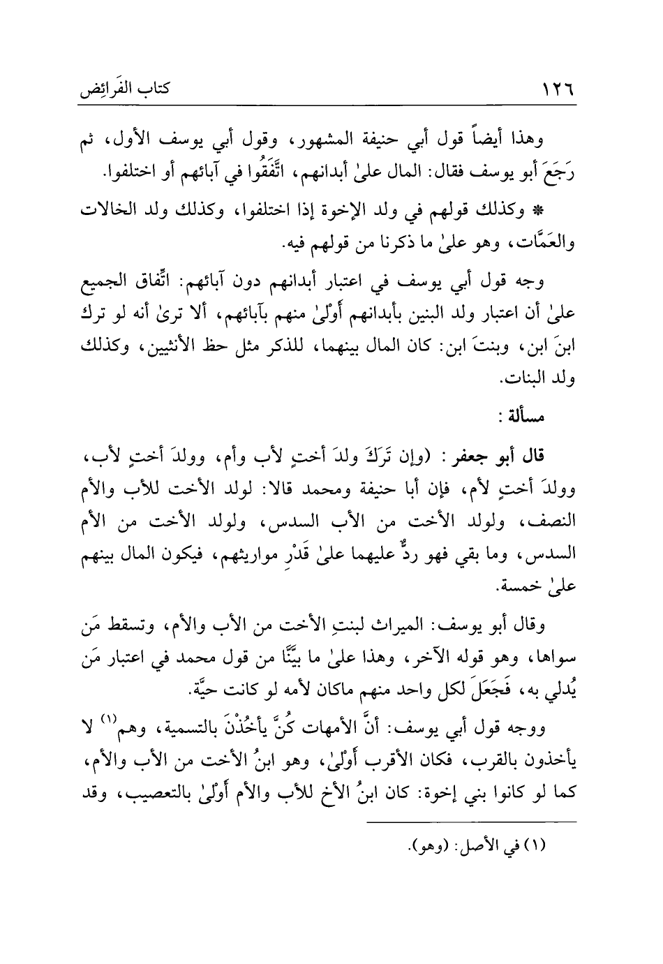 قال أبو جعفر: (وإن ترك ولد أختٍ لأب وأم، وولد أختٍ لأب، وولد أختٍ لأم، فإن أبا حنيفة ومحمد قالا: لولد الأخت للأب والأم النصف، ولولد الأخت من الأب السدس، ولولد الأخت من الأم السدس، وما بقي فهو رد عليهما على قدر مواريثهم، فيكون المال بينهم على خمسة.