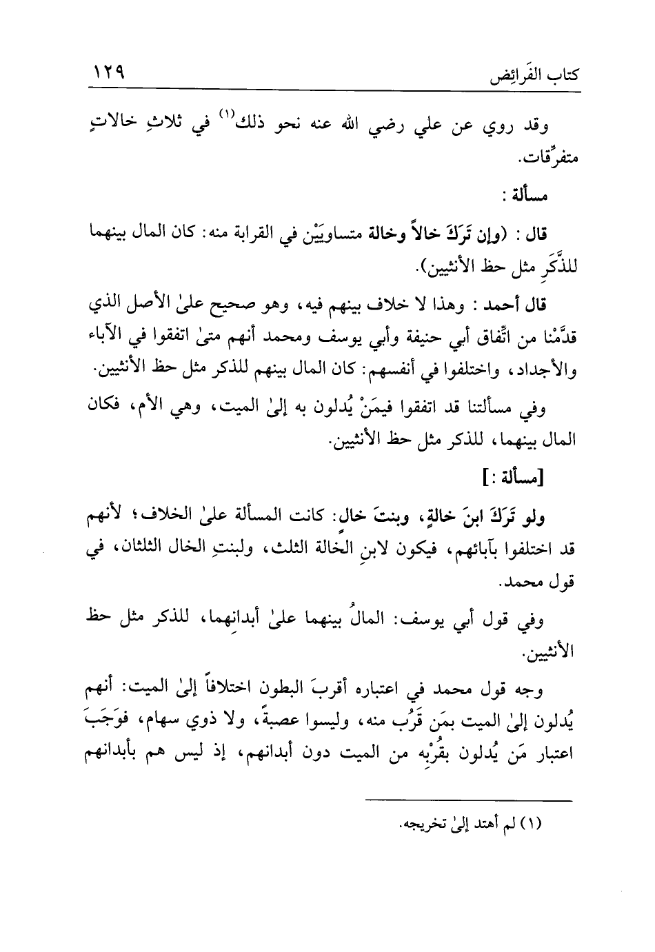 قال أحمد: وهذا لا خلاف بينهم فيه، وهو صحيح على الأصل الذي قدمنا من اتفاق أبي حنيفة وأبي يوسف ومحمد أنهم متى اتفقوا في الآباء والأجداد، واختلفوا في أنفسهم: كان المال بينهم للذكر مثل حظ الأنثيين.