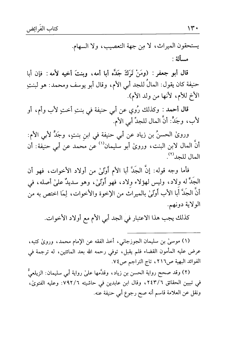 قال أبو جعفر: (ومن ترك جده أبا أمه، وبنت أخيه لأمه: فإن أبا حنيفة كان يقول: المال لجد أبي الأم، وقال أبو يوسف ومحمد: هو لبنت الأخ للأم، لأنها من ولد الأم).