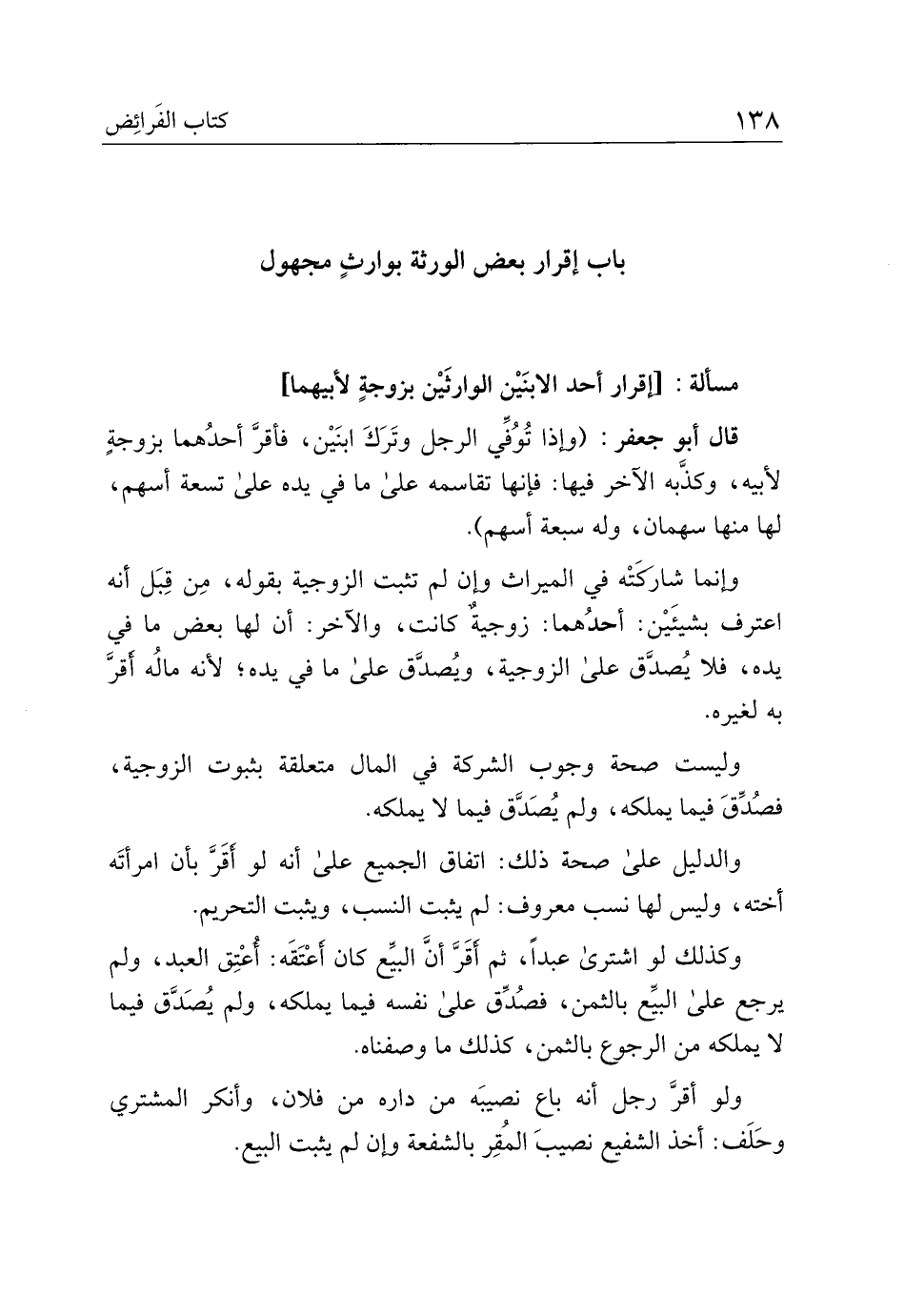 قال أبو جعفر: (وإذا توفي الرجل وترك ابنين، فأقر أحدهما بزوجة لأبيه، وكذبه الآخر فيها: فإنها تقاسمه على ما في يده على تسعة أسهم، لها منها سهمان، وله سبعة أسهم).