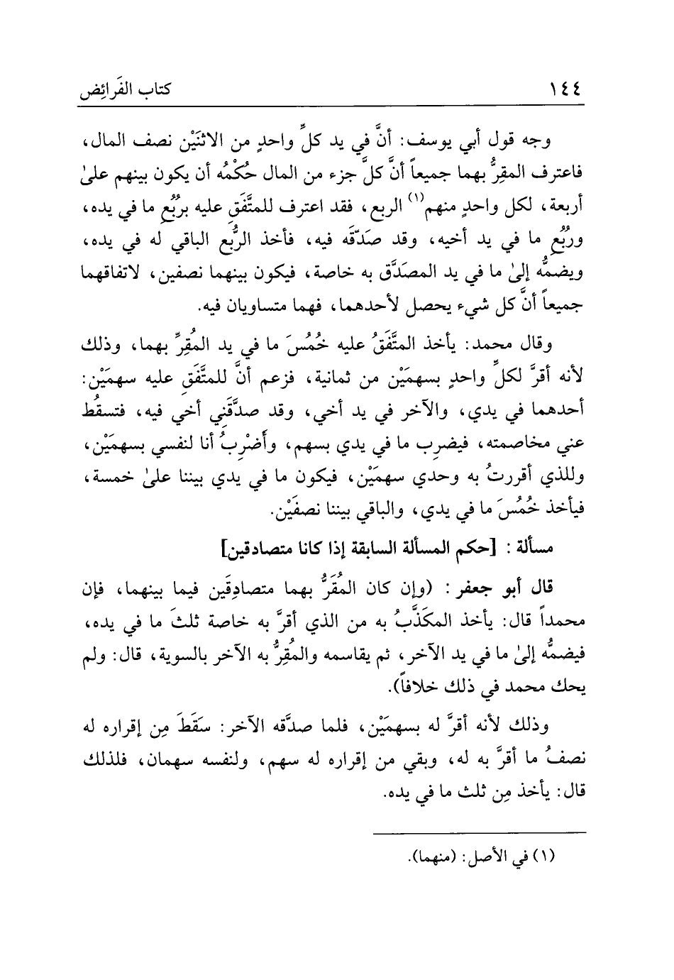 وجه قول أبي يوسف: أن في يد كل واحدٍ من الاثنين نصف المال، فاعترف المقر بهما جميعًا أن كل جزء من المال حكمه أن يكون بينهم على أربعة، لكل واحدٍ منهم الربع، فقد اعترف للمتفق عليه بربع ما في يده، وربع ما في يد أخيه، وقد صدقه فيه، فأخذ الربع الباقي له في يده، ويضمه إلى ما في يد المصدق به خاصة، فيكون بينهما نصفين، لاتفاقهما جميعًا أن كل شيء يحصل لأحدهما، فهما متساويان فيه.
