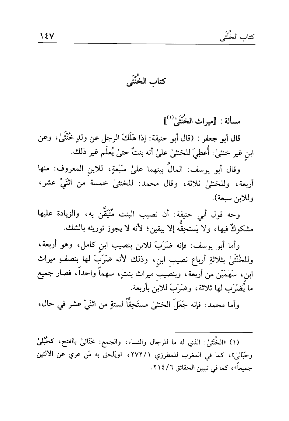 قال أبو جعفر: (قال أبو حنيفة: إذا هلك الرجل عن ولد خنثى، وعن ابن غير خنثى: أعطي للخنثى على أنه بنت حتى يعلم غير ذلك.