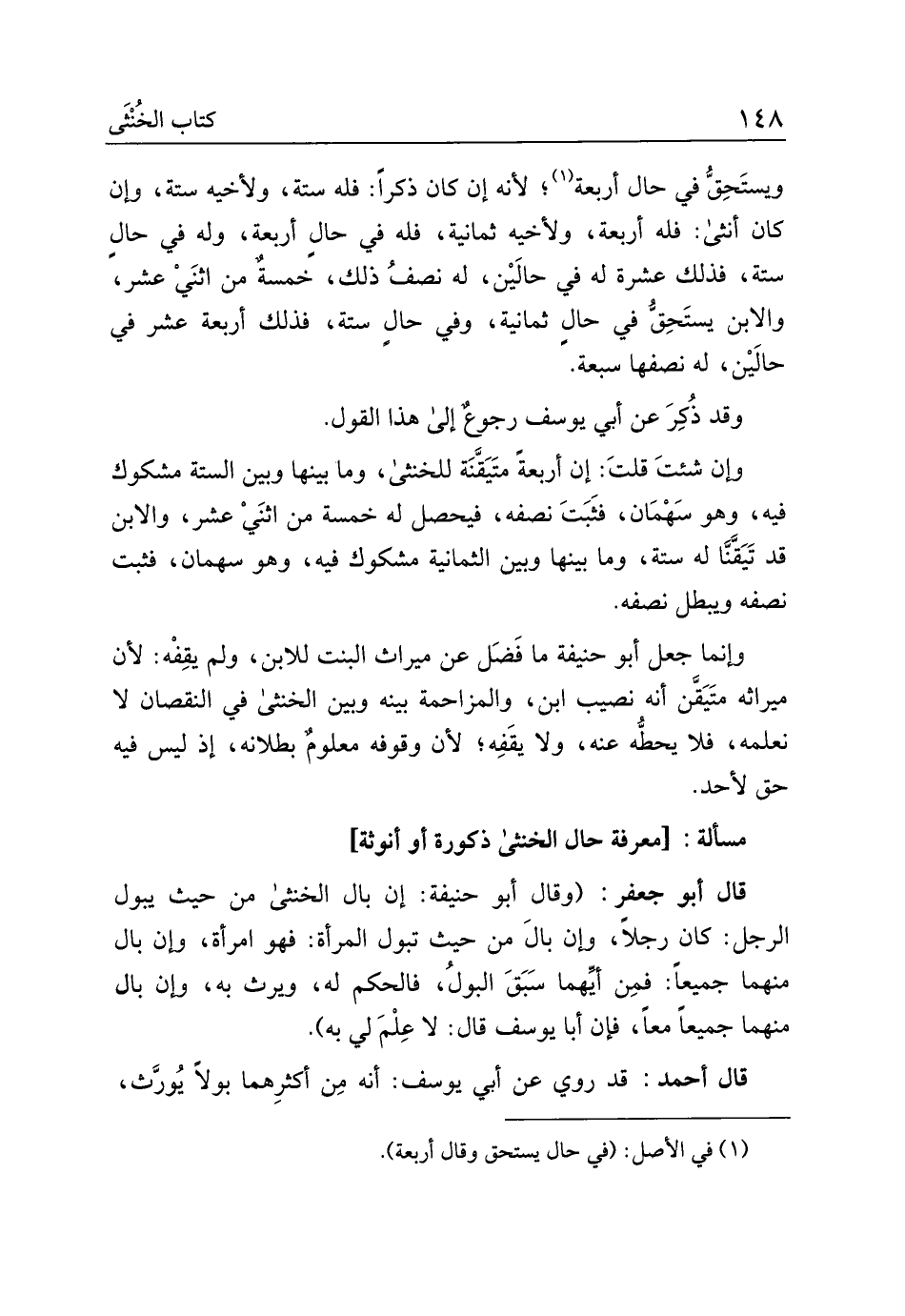 قال أحمد: قد روي عن أبي يوسف: أنه من أكثرهما بولًا يورث،