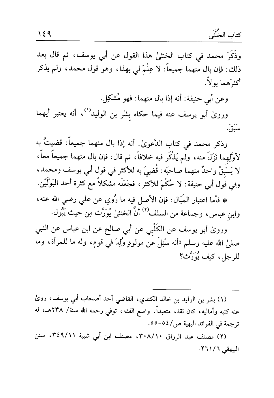 وذكر محمد في كتاب الخنثى هذا القول عن أبي يوسف، ثم قال بعد ذلك: فإن بال منهما جميعًا: لا علم لي بهذا، وهو قول محمد، ولم يذكر أكثرهما بولًا.