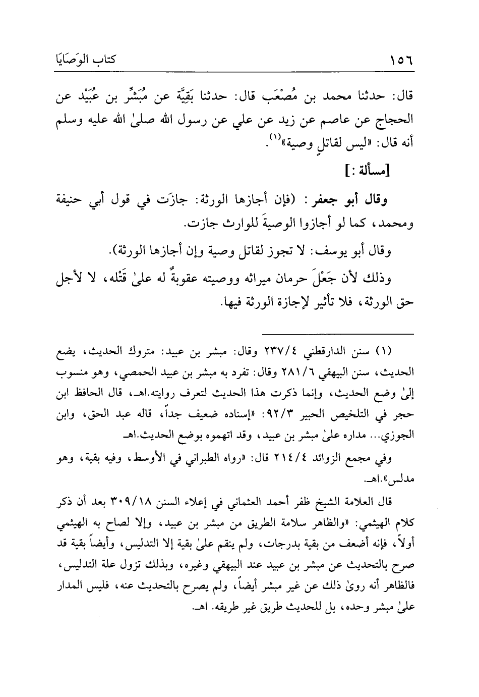 قال: حدثنا محمد بن مصعب قال: حدثنا بقية عن مبشر بن عبيد عن الحجاج عن عاصم عن زيد عن علي عن رسول الله صلي الله عليه وسلم أنه قال: "ليس لقاتل وصية".