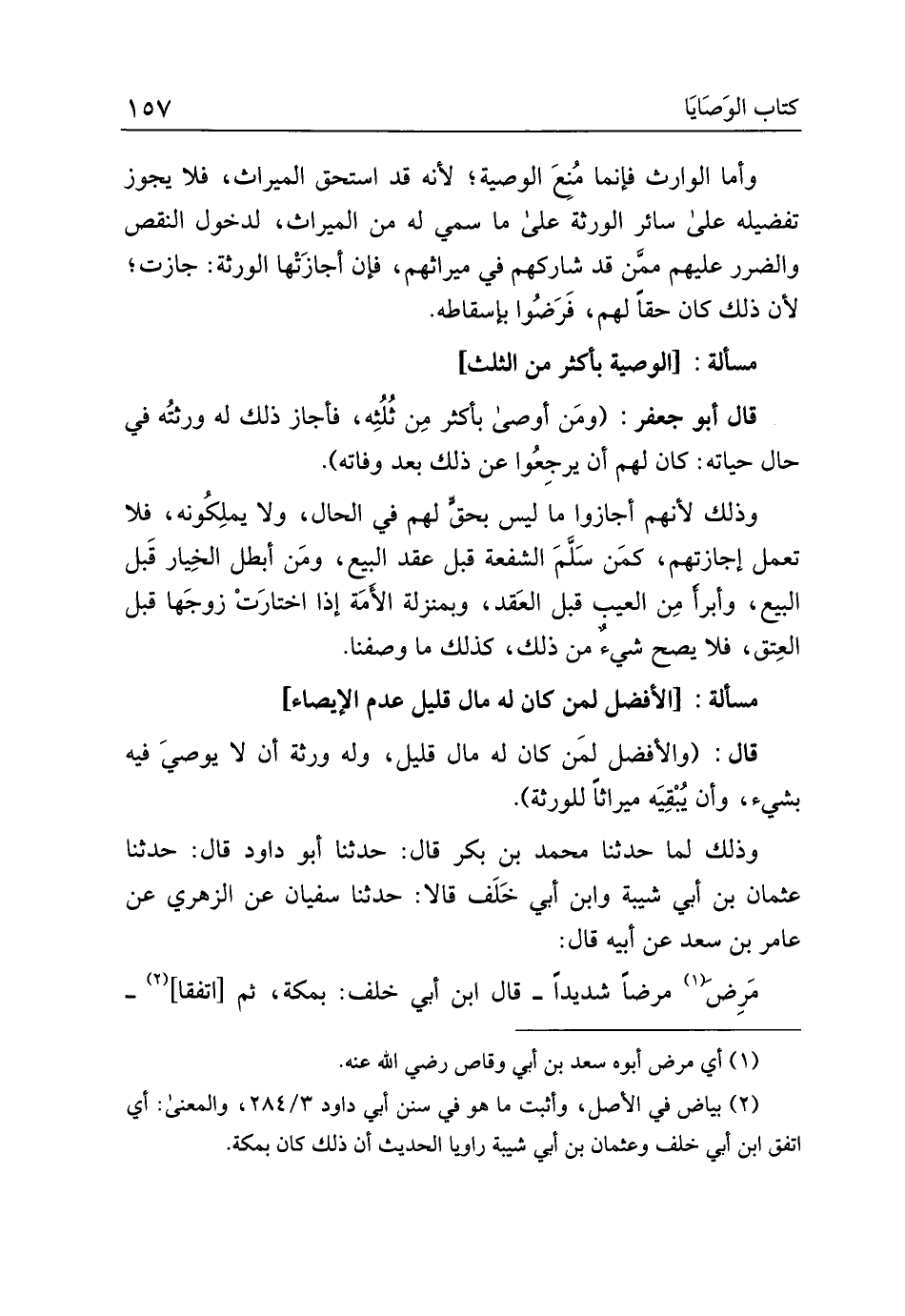 قال أبو جعفر: (ومن أوصى بأكثر من ثلثه، فأجاز ذلك له ورثته في حال حياته: كان لهم أن يرجعوا عن ذلك بعد وفاته).