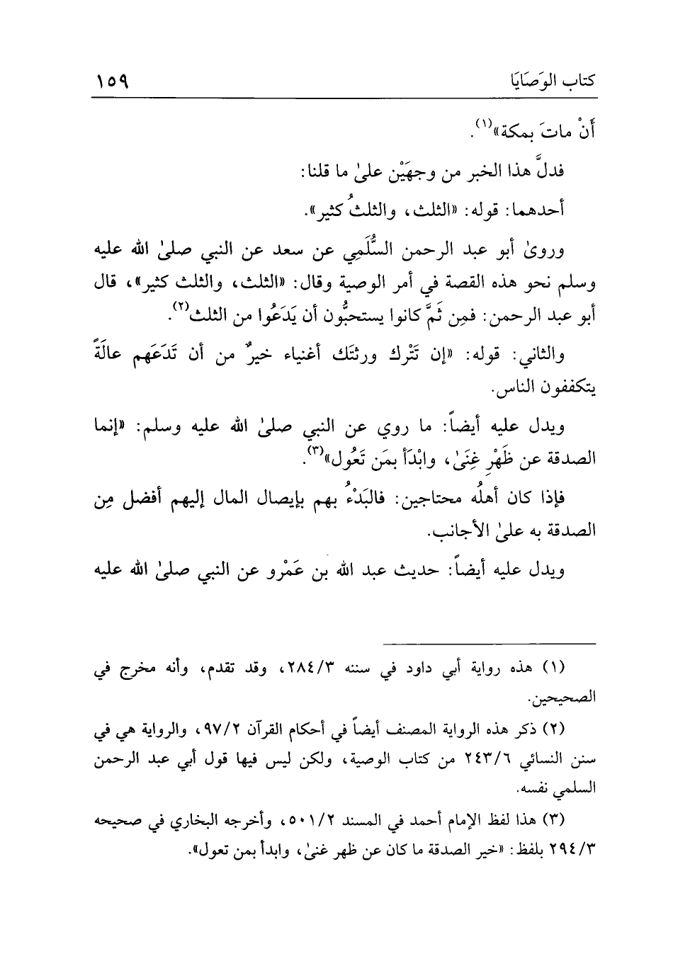 وروى أبو عبد الرحمن السلمي عن سعد عن النبي صلي الله عليه وسلم نحو هذه القصة في أمر الوصية وقال: "الثلث، والثلث كثير". قال أبو عبد الرحمن: فمن ثم كانوا يستحبون أن يدعوا من الثلث.