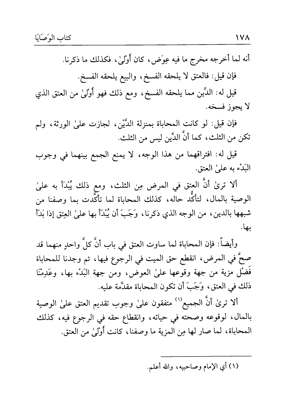 ألا ترى أن الجميع متفقون على وجوب تقديم العتق على الوصية بالمال، لوقوعه وصحته في حياته، وانقطاع حقه في الرجوع فيه، كذلك المحاباة، لما صار لها من المزية ما وصفنا، كانت أولى من العتق.