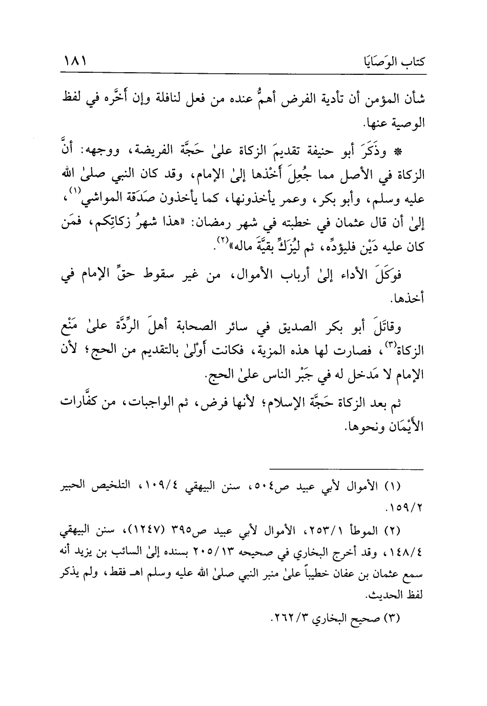* وذكر أبو حنيفة تقديم الزكاة على حجة الفريضة، ووجهة: أن الزكاة في الأصل مما جعل أخذها إلى الإمام، وقد كان النبي صلي الله عليه وسلم، وأبو بكر، وعمر يأخذونها، كما يأخذون صدقة المواشي، على أن قال عثمان في خطبته في شهر رمضان: "هذا شهر زكاتكم، فمن كان عليه دين فليؤده، ثم ليزك بقية ماله".