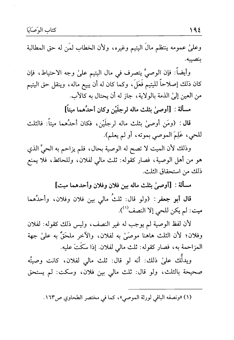 لأن لفظ الوصية لم يوجب له غير النصف، وليس ذلك كقوله: لفلان وفلان؛ لأن الثلث هاهنا موصى به لفلان، والآخر ملحق به على جهة المزاحمة به، فصار كقوله: ثلث مالي لفلان. إذا سكت عليه.