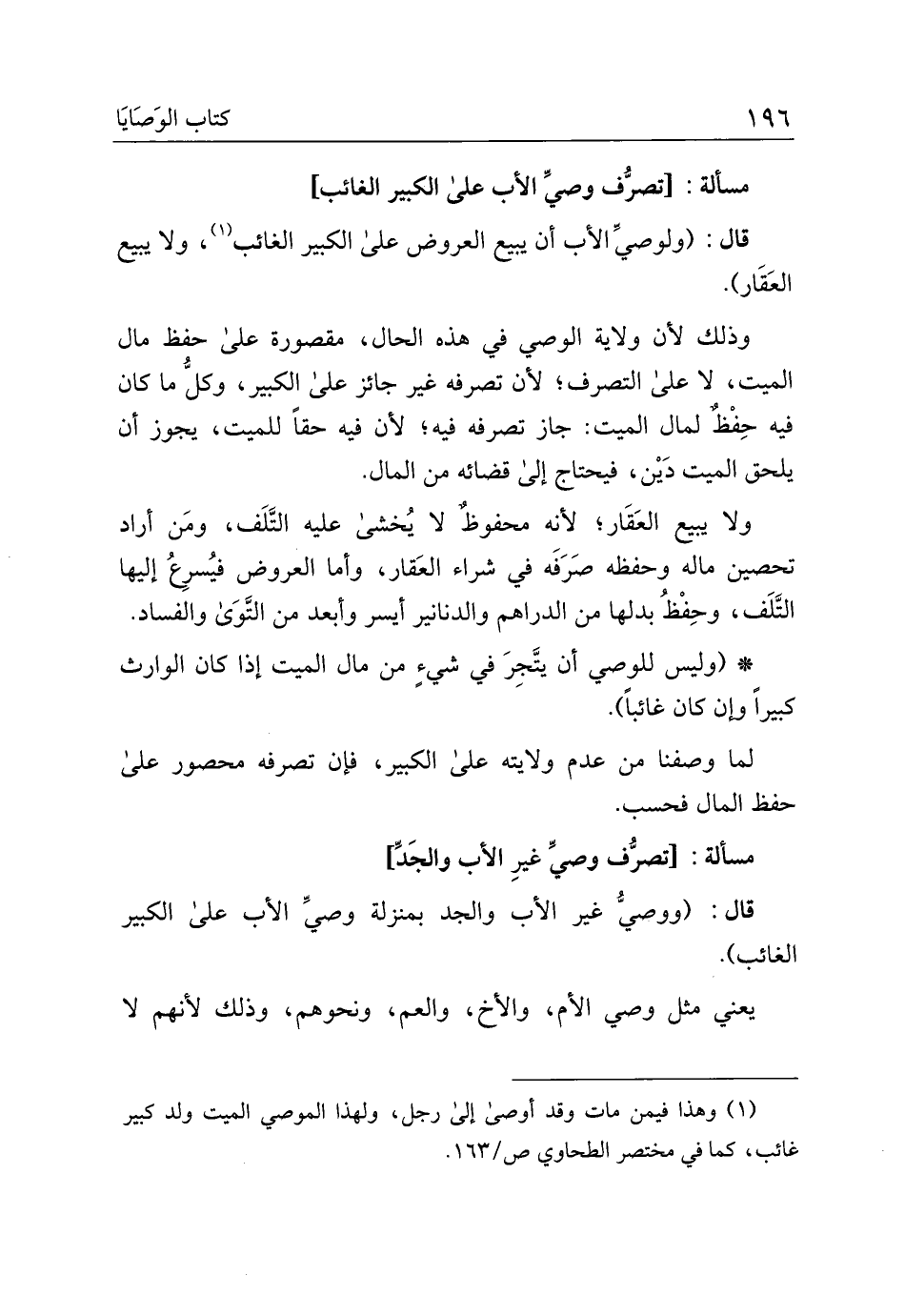 وذلك لأن ولاية الوصي في هذه الحال، مقصورة على حفظ مال الميت، لا علي التصرف؛ لأن تصرفه غير جائز على الكبير، وكل ما كان فيه حفظ لمال الميت: جاز تصرفه فيه؛ لن فيه حقًا للميت، يجوز أن يلحق الميت دين، فيحتاج إلى قضائه من المال.