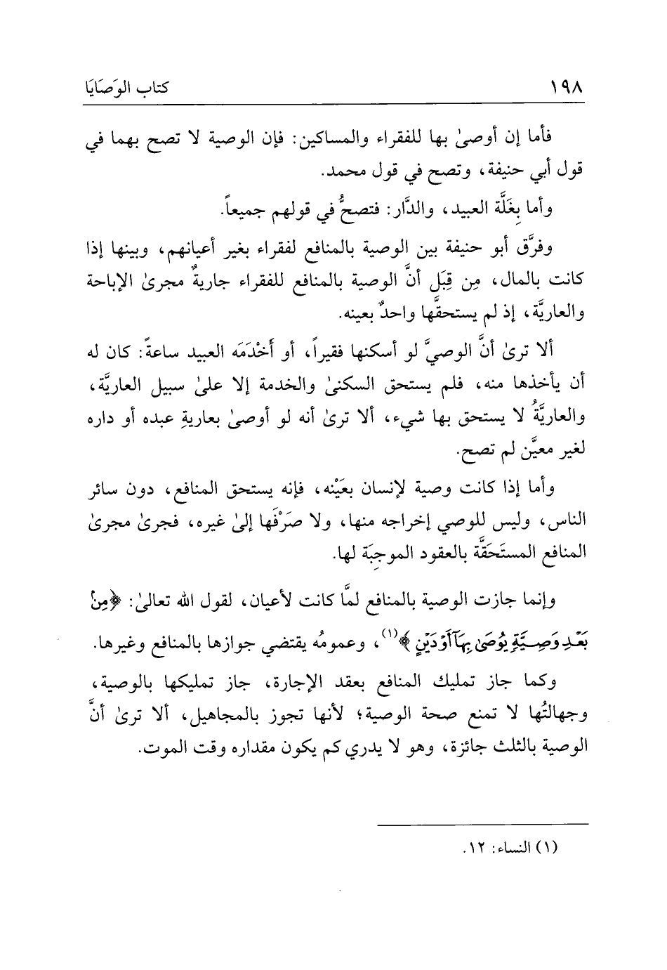 وفرق أبو حنيفة بين الوصية بالمنافع لفقراء بغير أعيانهم، وبينها إذا كانت بالمال، من قبل أن الوصية بالمنافع للفقراء جارية مجرى الإباحة والعارية، إذ لم يستحقها واحدٌ بعينه.