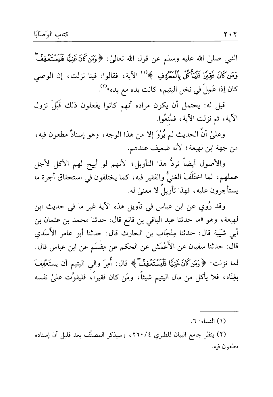وقد روي عن أبن عباس في تأويل هذه الآية غير ما في حديث ابن لهيعة، وه و" ما حدثنا عبد الباقي بن قانع قال: حدثنا محمد بن عثمان بن أبي شيبة قال: حدثنا أبو عامر الأسدي قال: حدثنا سفيان عن الأعمش عن الحكم عن مقسم عن ابن عباس قال: لما نزلت: {ومن كان غنيا فليستعفف} قال: أمر والي اليتيم أن يستعفف بغناه، فلا يأكل من مال اليتيم شيئا، ومن كان فقيرًا، فليقوّت على نفسه