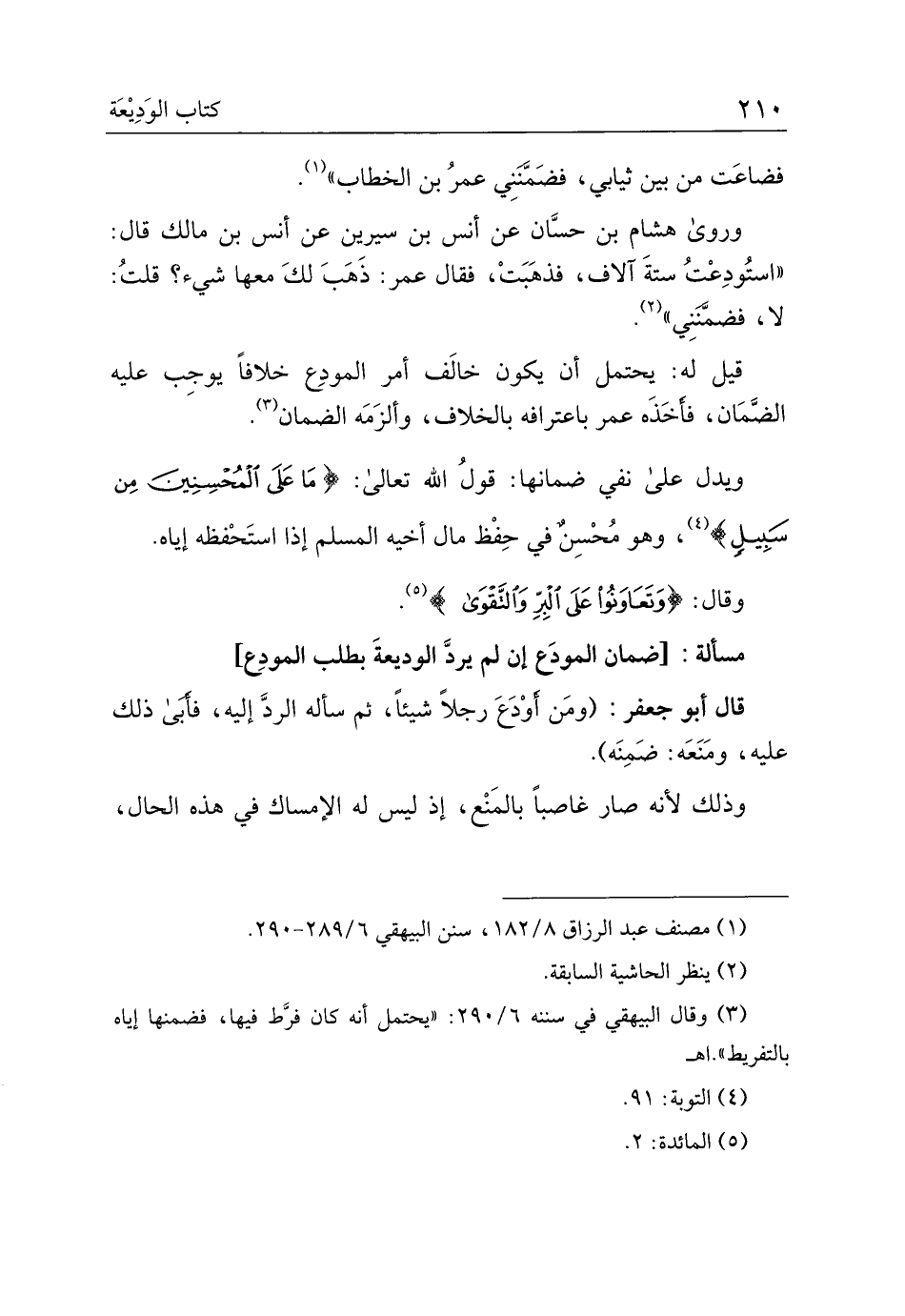 وروى هشام بن حسان عن أنس بن سيرين عن أنس بن مالك قال: " استودعت ستة آلاف، فذهبت، فقال عمر: ذهب لك معها شيء؟ قلت: لا، فضمنني".